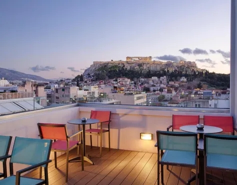 Hotel se nalazi ispod brda Akropolja i usred antičke raskoši koja čini Atinu najvažnijom izložbenom vitrinom za Klasiku.