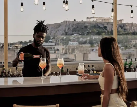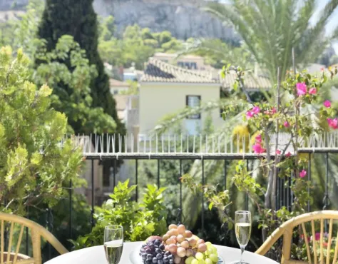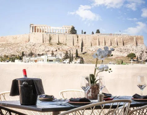Hotel se nalazi ispod brda Akropolja i usred antičke raskoši koja čini Atinu najvažnijom izložbenom vitrinom za Klasiku.
