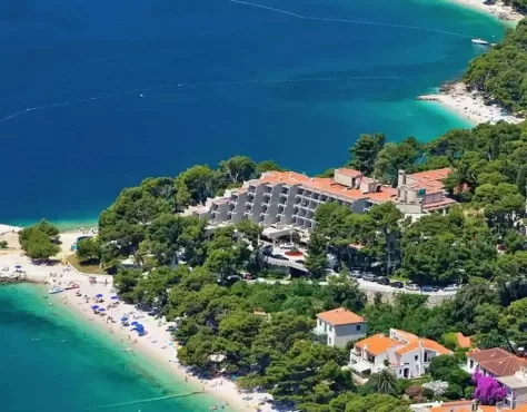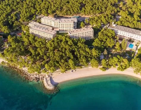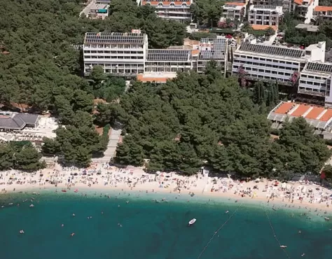 Hotel Bluesun Maestral Brela se nalazi na uredjenoj šljunkovito-peskovitoj plaži, sakriven u hladu krošnji dr