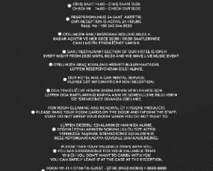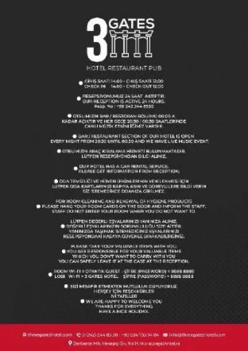 3 GATES HOTEL pruža besprekornu uslugu i sve neophodne sadržaje za posetioce. Upoznavanje Antalije postaje još pristupačnije zahvaljujući taksiju i mogućnosti iznajmljivanja automobila koje su dostupne u hotelu. Tokom boravka u ovom fantastičnom hotelu, pažljivo osoblje na recepciji može vam pružiti različite pogodnosti poput čuvanja prtljaga i sefovima za čuvanje vrednosti. Za duže boravke ili kada je potrebno, usluga pranja veša osigurava da vaša omiljena putna odeća ostane sveža i pristupačna. Za posetioce željne pušenja, postoje posebne zone za pušenje. U 3 GATES HOTEL-u, svaka soba gostima je opremljena pogodnostima i opremom kako bi se obezbedio udoban boravak.