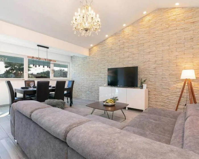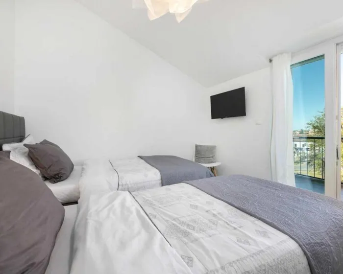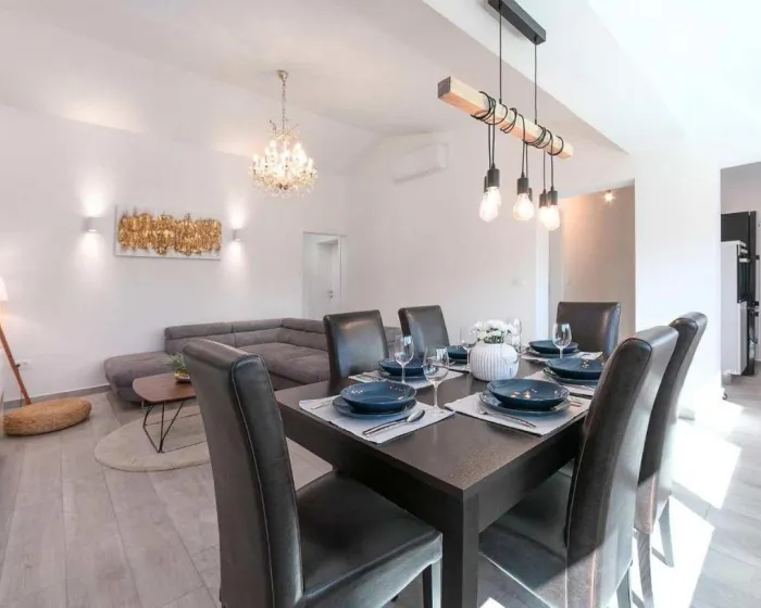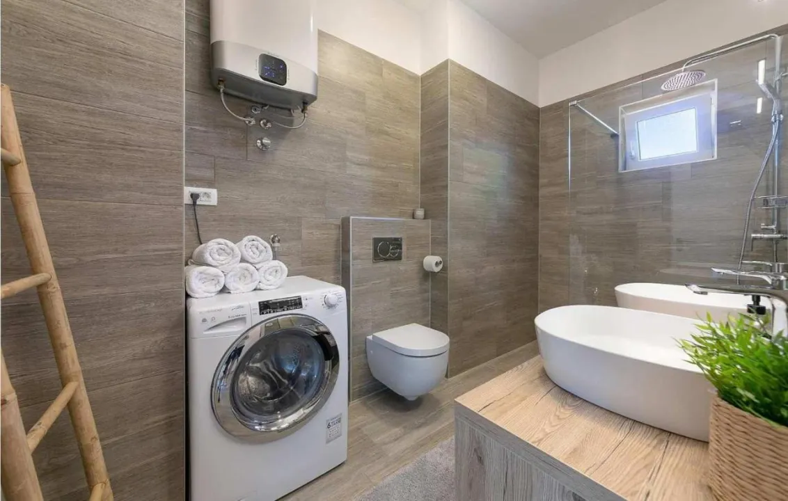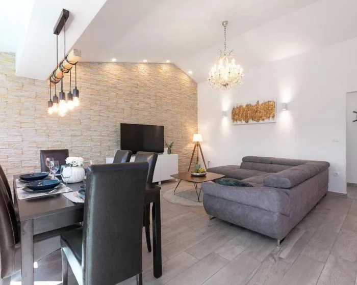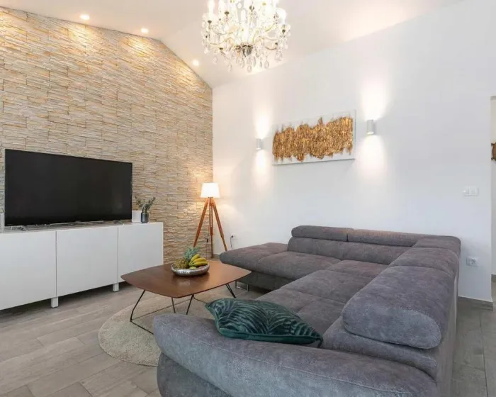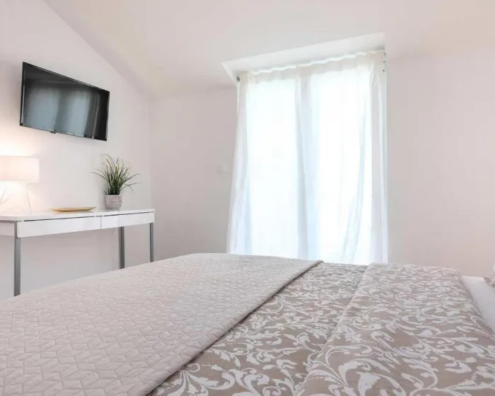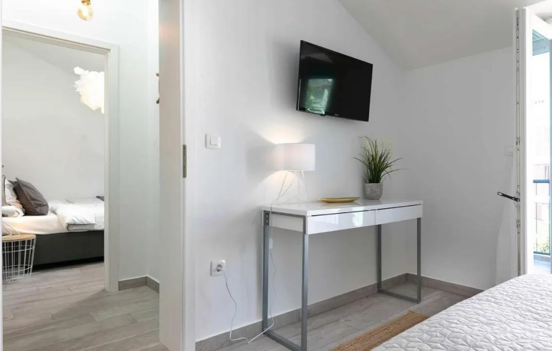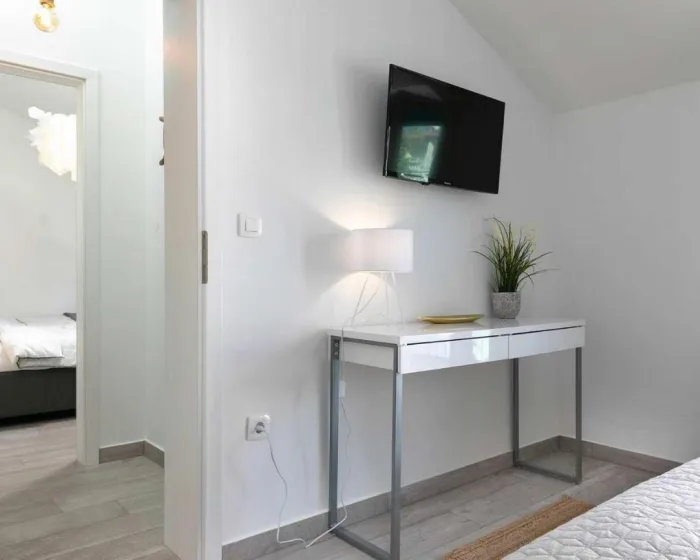 Prostrani apartman ima 2 odvojene spavaće sobe, 1 kupatilo, potpuno opremljenu kuhinju sa trpezarijom i mašinom za pranje sudova, kao i dnevni boravak sa TV-om. Radi veće privatnosti, smeštaj ima privatni ulaz.
