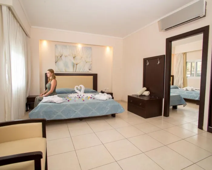 Sobe sadrže dnevnu sobu, kuhinju i kupatilo. Klima uređaj obezbeđuje udobne temperature. Gosti mogu da se opuste i uživaju u pogledu na more sa terase ili privatne terase nekih soba. Sobe sadrže king-size krevet i sofu na razvlačenje. Dostupne su odvojene spavaće sobe. Kreveti za decu i dodatni kreveti mogu se zatražiti za mlađe goste. Takođe su dostupni sef i mini bar. Za gosteovu udobnost, jedinice uključuju frižider, mini frižider i aparat za kafu/čaj. Direktno biranje telefona, televizor sa satelitskim/ kablovskim kanalima i WiFi (bez dodatne naplate) pružaju sve osnovne potrebe za udoban odmor. Fen za kosu i telefon dostupni su u kupatilima, opremljenim tušem i kadom. Kupatila sa pristupom za invalide takođe se mogu rezervisati. Hotel ima porodične sobe i sobe za nepušače.