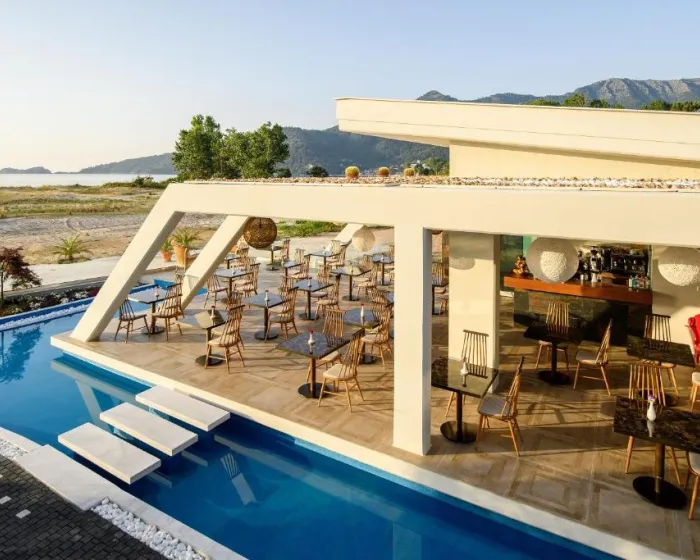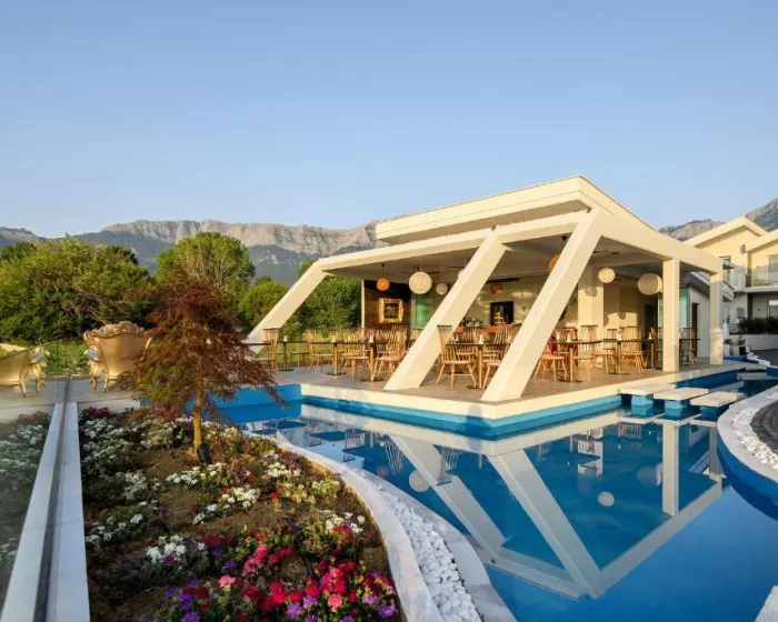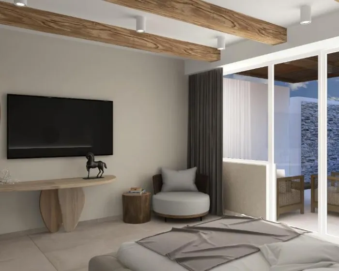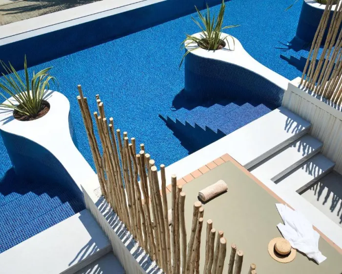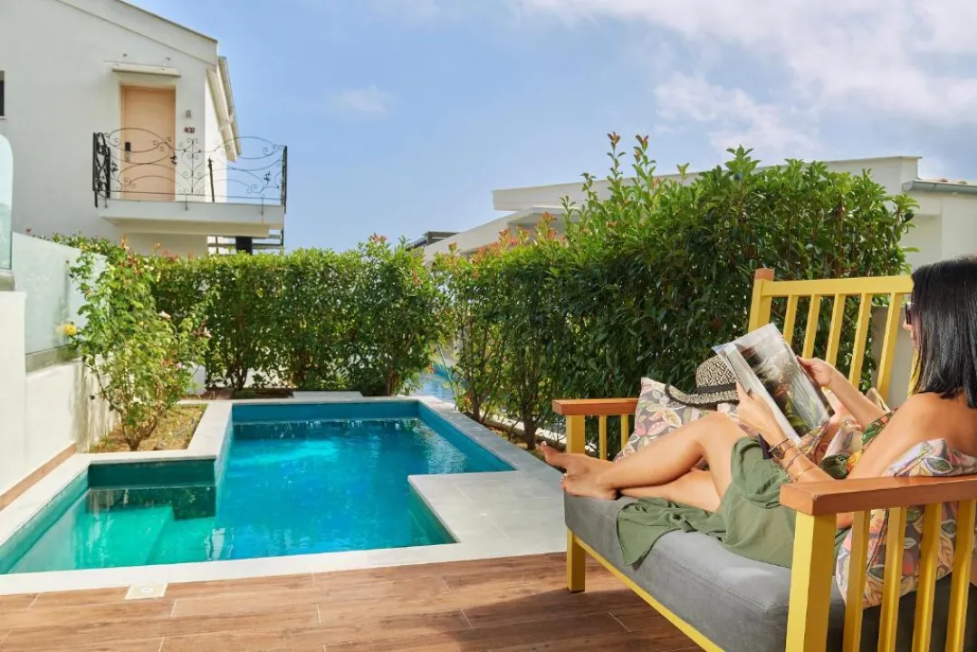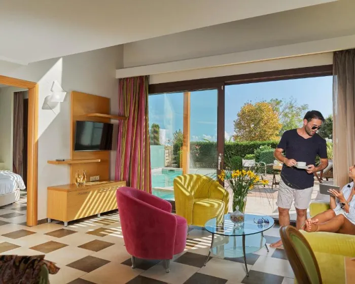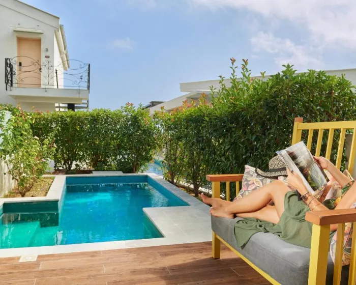 Junior suite sa privatnim bazenom Oko 32 m². Modernog dizajna, sa toplim i elegantnim enterijerom. Svaka juinor suite sa bazenom raspolaže velikim bračnim ležajem, prostranim kupatilom sa tuš kabinom i uglom za doručak, kao i malim privatnim bazenom na verandi. Dizajnirana je za 2 osobe.