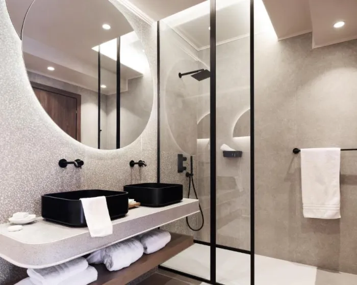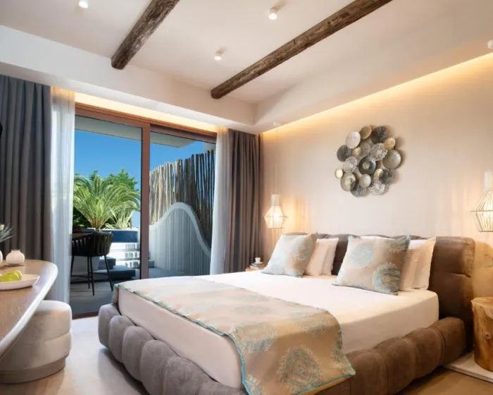 Junior suite pogled more Oko 30 m², sa pogledom na more. Modernog dizajna sa toplim i elegantnim enterijerom, predvidjena za 2 osobe, king size francuski ležaj.