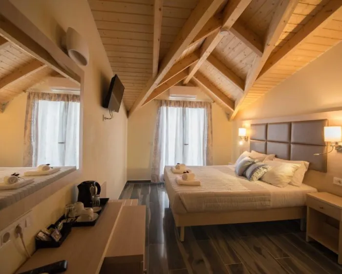 Junior Suite (~25 m²) - francuski ležaj, bade mantili i papuče, aparat za kafu Nespresso.