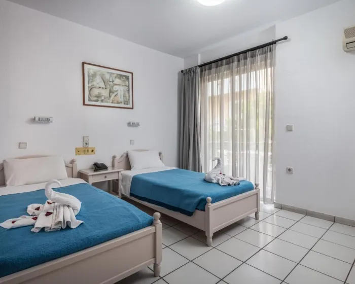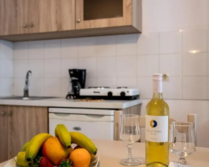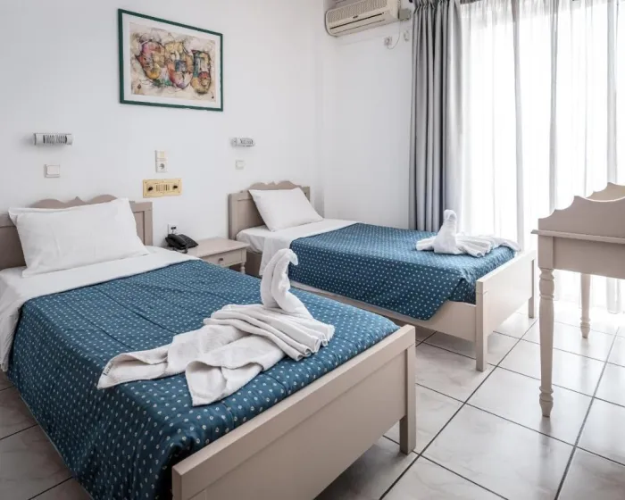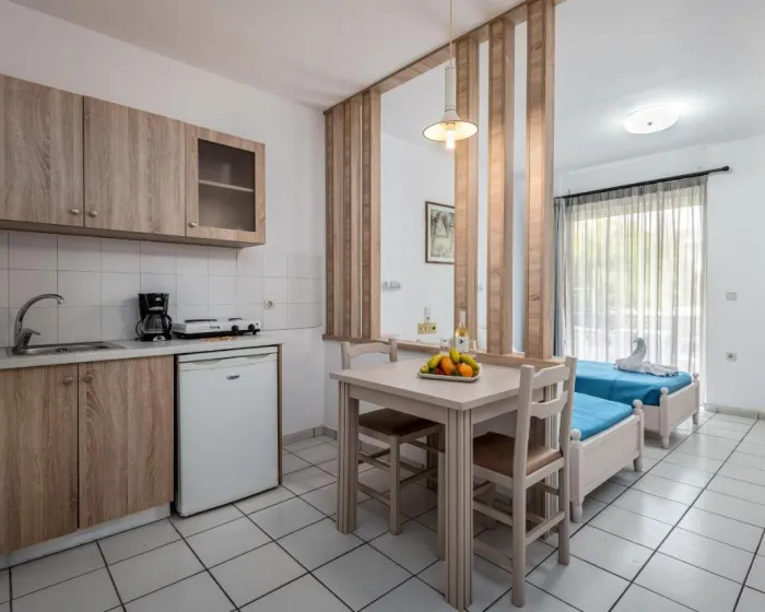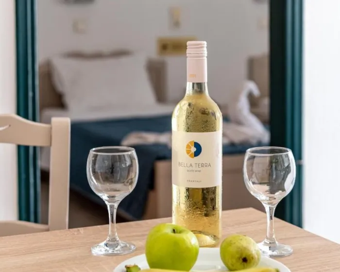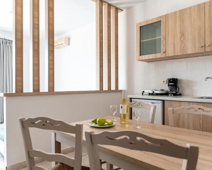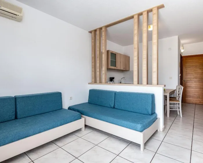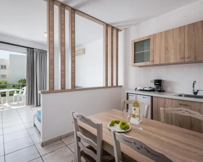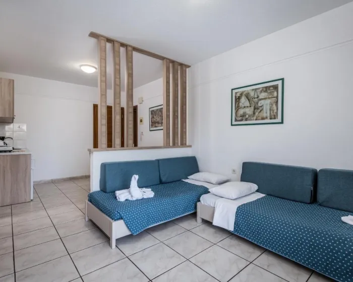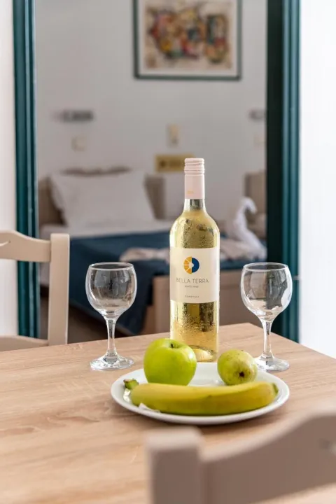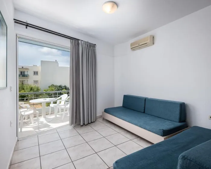 Klima uređaj i podesivo centralno grejanje osiguravaju udobne temperature u sobama. Gosti mogu uživati u pogledu na more sa balkona ili terase. Sobe imaju bračni krevet i sofu na razvlačenje. Dostupne su odvojene sobe. Dodatni kreveti mogu biti zatraženi. Na raspolaganju su sef i radni sto. Za goste koji sami sebi pripremaju hranu, postoji dobro opremljena kuhinjica sa frižiderom, mini frižiderom, šporetom i aparatom za kafu/čaj. Pegla je obezbeđena radi praktičnosti gostiju. Takođe su obezbeđeni direktni telefonski poziv, televizor sa satelitskim/kablovskim kanalima, radio, CD plejer i WiFi (bez dodatne naplate). Kupatila su opremljena tušem i kadom, kao i fenom za kosu. Kozmetički proizvodi i izbor peškira pružaju dodatnu udobnost u kupatilima. Apartmanski hotel ima porodične sobe i sobe za nepušače.