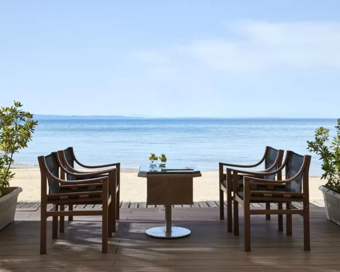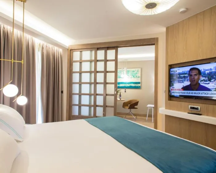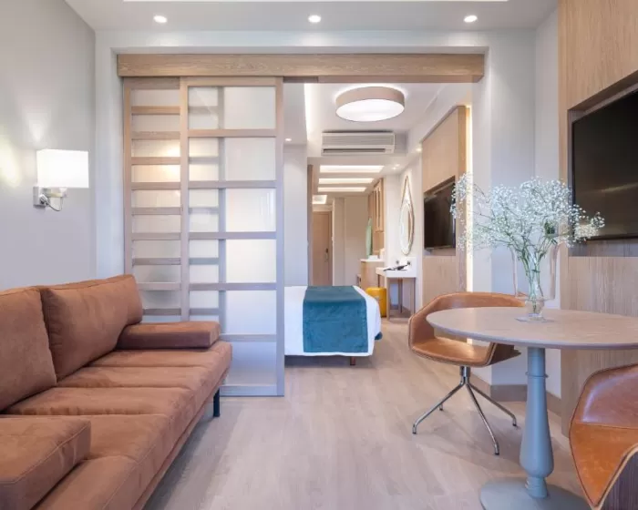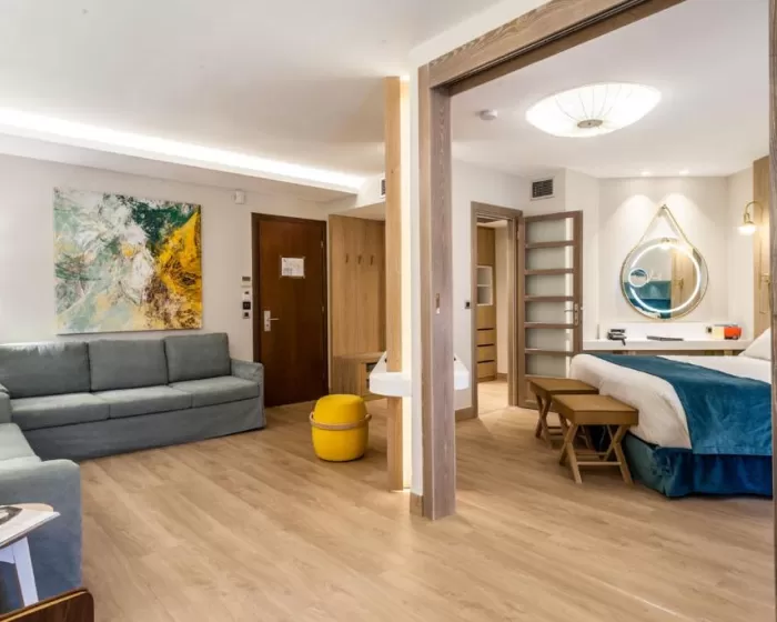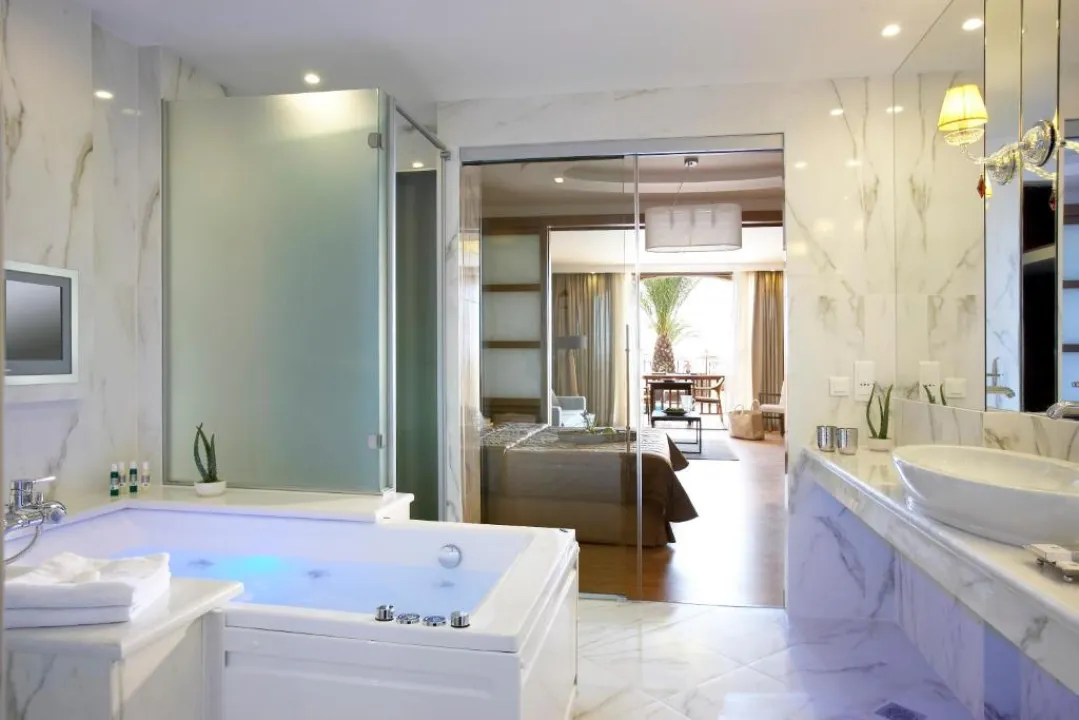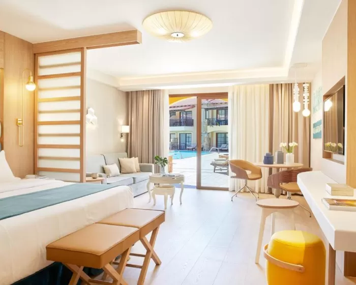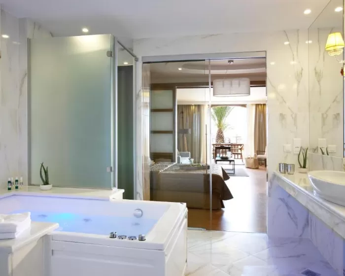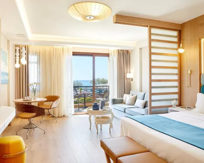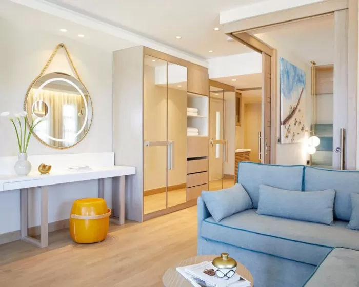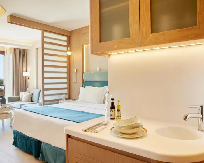 Junior suite: oko 35-40m², kombinovana dnevno-spavaća prostorija (dva standardna ležaja i sofa), sa pogledom na more/bazen ili na baštu, namenjene za 2-4 osobe. Dodatno su opremljene kupatilom sa hidromasažnim tušem i kadom, bade-mantilima, luksuznim proizvodima u kupatilu, poklonom dobrodošlice.