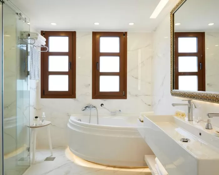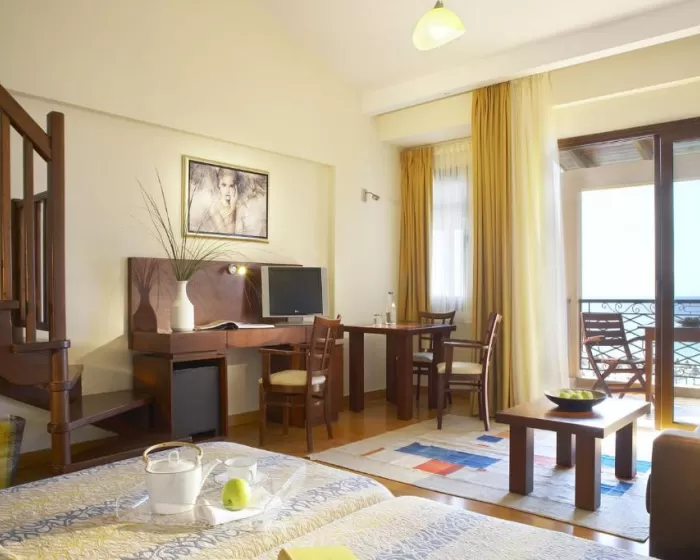 Deluxe suite: oko 42-52m², sastoje se iz dnevne sobe sa sofom na razvlačenje i spavaće sobe (mogu biti i na dva nivoa u stilu mezoneta) sa pogledom na baštu ili na more/bazen, namenjene za 2-5 osoba