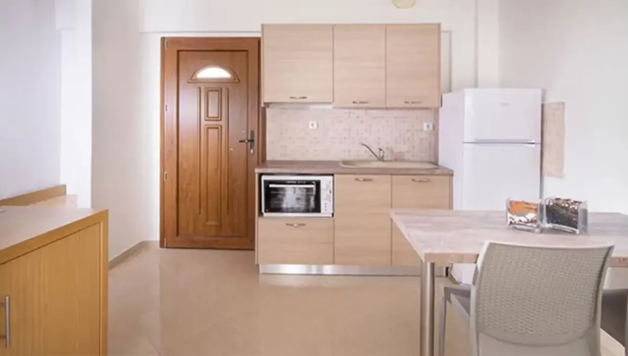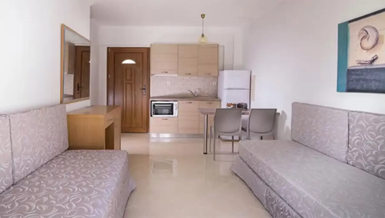 Apanemia Flegra Pefkohori se nalazi na oko 500 metara udaljenosti od plaže i oko 50 metara od centra letovališta Pefkohori. Autobuska stanica je na oko 150 metara od hotela. Izgradjen je 2019. godine. Uponudi su apartmani u kojima može boraviti do 5 osoba. Sobe se čiste svakodnevno, promena peškira je dva puta nedeljno, a posteljine jednom nedeljno.