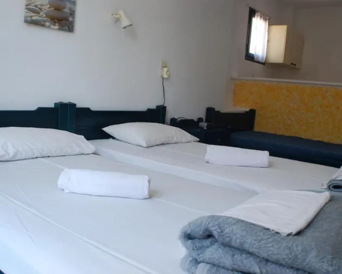 Ukupno 22 sobe: Studios (28-30 m²), Apartments (45 m²).U sobama: klima (uz doplatu na licu mesta), kupatilo (tuš), fen, sef (uz doplatu na licu mesta), kuhinja (električni šporet sa 2 ringle, rerna, čajnik, posudje), frižider, televizor, telefon, wifi internet (uz doplatu na licu mesta), balkon/terasa.