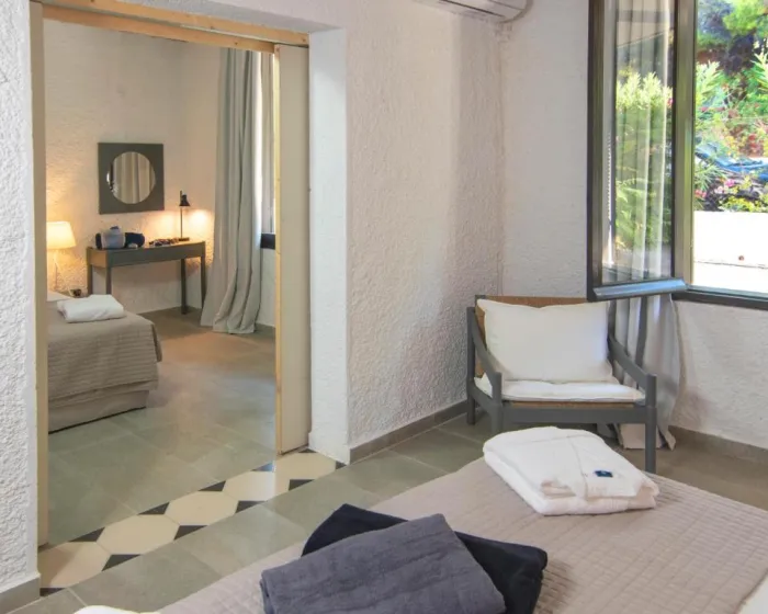 Sobe su opremljene klima uređajem i centralnim grejanjem. Gosti mogu da se opuste i uživaju u pogledu na more sa terase ili privatne terase nekih soba. Sobe imaju bračni krevet ili krevet veličine king-size. Dodatni kreveti se mogu zatražiti. Sef i minibar su takođe dostupni. Gosti će takođe pronaći frižider među standardnim funkcijama. Pegla za pantalone je obezbeđena radi praktičnosti gostiju. Takođe su obezbeđeni telefon, TV i WiFi. Papuče su uključene. Kupatila su opremljena tušem. Fen za kosu, bade mantili i telefon su dostupni za svakodnevnu upotrebu. Za dodatnu udobnost u kupatilima, gostima se nude kozmetički proizvodi. Gosti mogu takođe rezervisati sobe prilagođene osobama u invalidskim kolicima sa kupatilima pristupačnim za invalidska kolica. Odmaralište ima porodične sobe i sobe za nepušače.