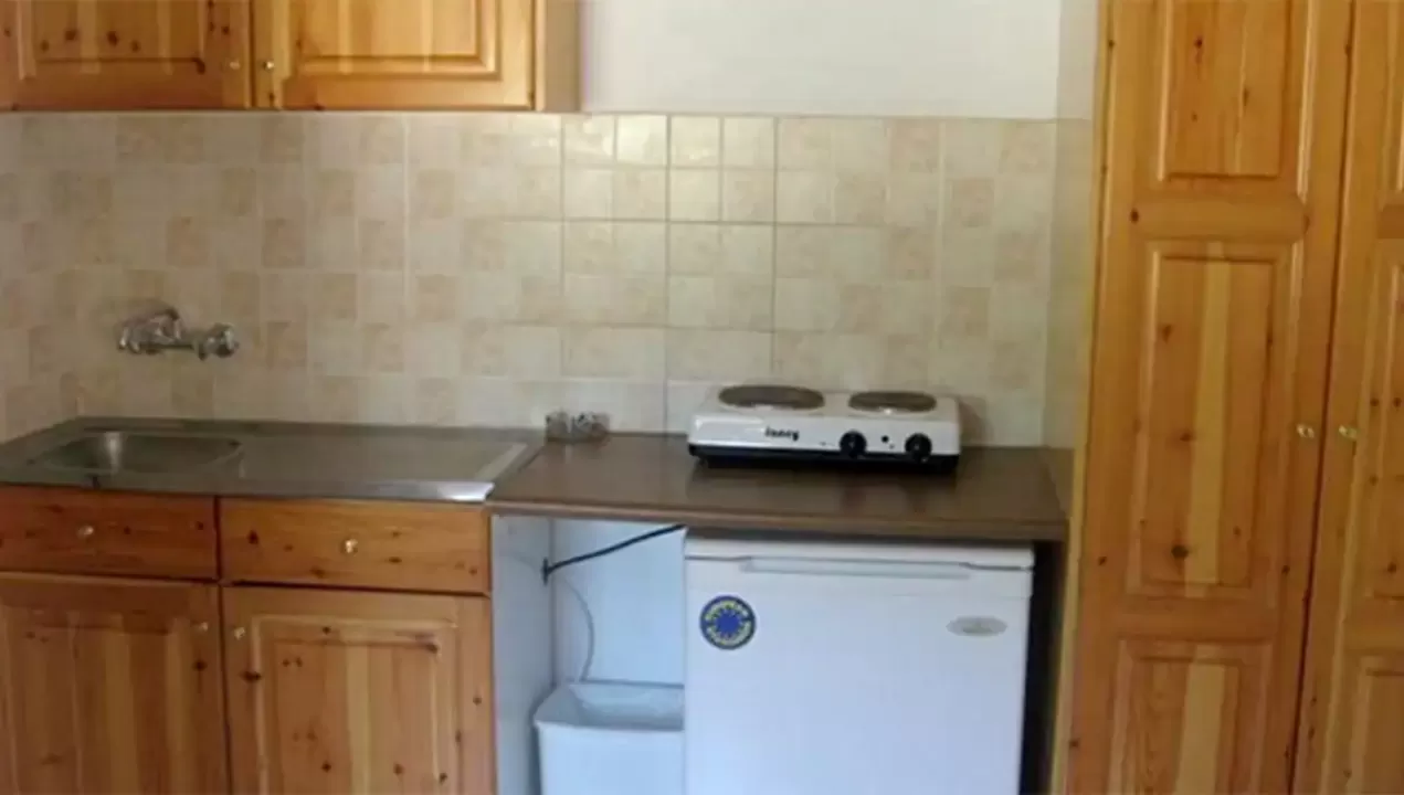 klima-uredjaj, TV, kuhinjski deo sa rešoom, frižider, kupatilo, balkon