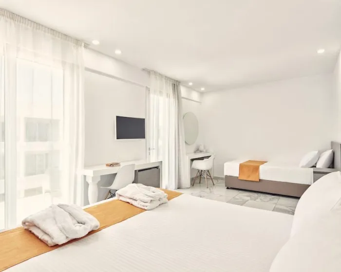 Klima uređaj i podesivo centralno grejanje osiguravaju da sobe održavaju prijatne temperature. Gosti mogu opuštati i uživati u pogledu na more sa balkona ili privatne terase nekih soba. Sobe imaju bračni krevet i kauč na razvlačenje. Dostupne su odvojene spavaće sobe. Kreveti za decu i pomoćni ležajevi mogu se zatražiti za mlađe goste. Takođe su dostupni sef, minibar i radni sto. Dodatne karakteristike uključuju frižider i aparata za kafu/čaj. Pegla za pantalone je obezbeđena radi praktičnosti gostiju. Takođe su obezbeđeni telefon, televizor sa satelitskim/kablovskim kanalima, radio i WiFi (bez dodatne naplate). Papuče su uključene. Kupatila su opremljena tušem i kadom. Fen za kosu, bade mantili i telefon su dostupni za svakodnevnu upotrebu. Kao poseban dodatak, kupatila su takođe opremljena kozmetičkim proizvodima i selekcijom peškira. Hotel ima porodične sobe i sobe za nepušače.