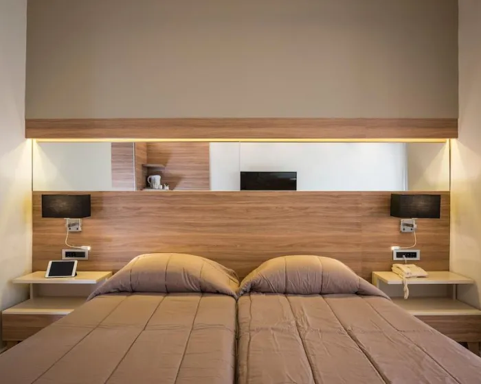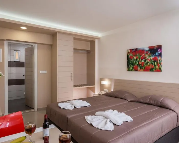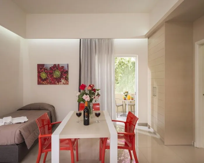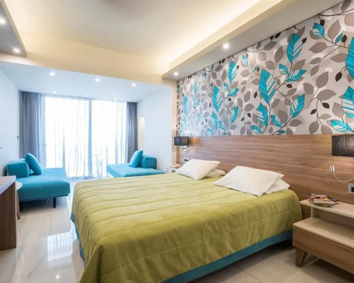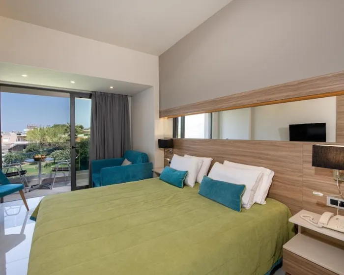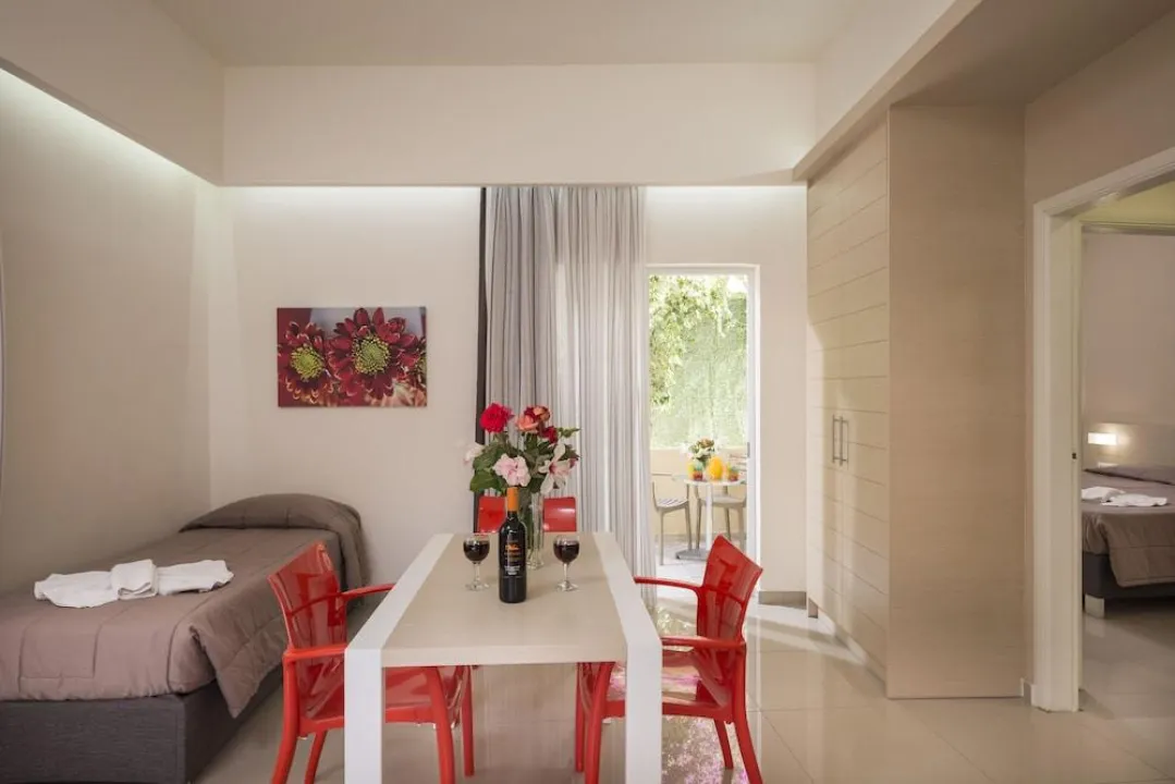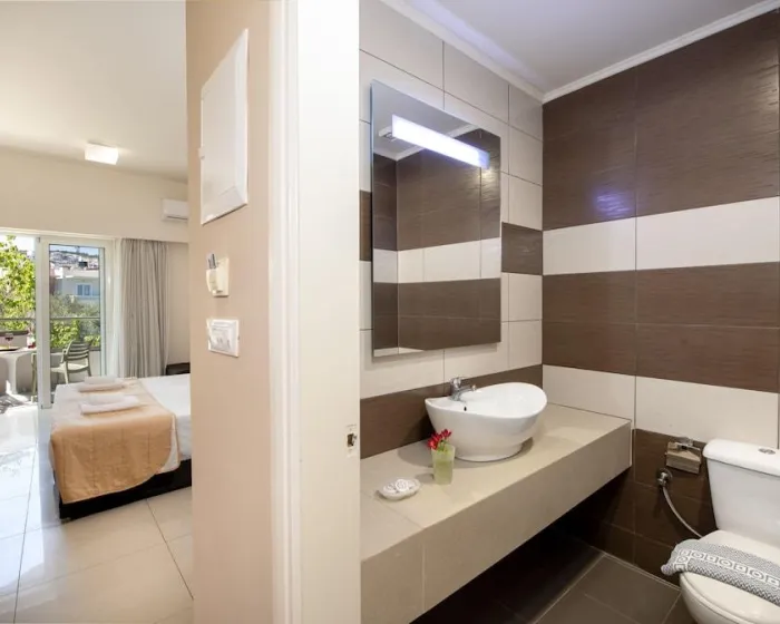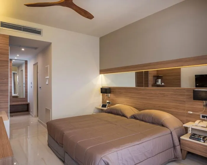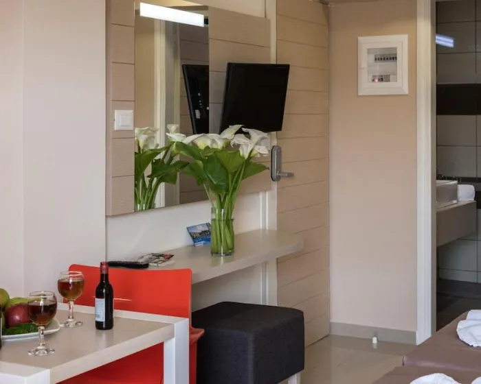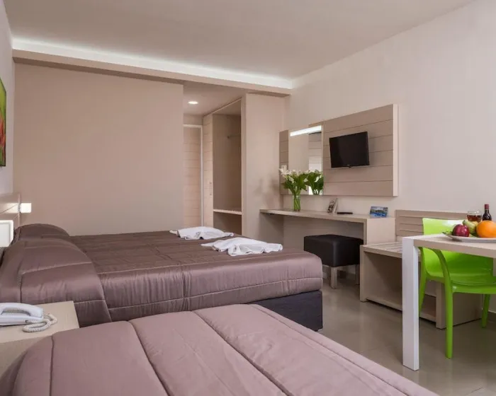 Rooms are equipped with air conditioning and central heating. Some rooms include a balcony. The rooms have a queen-size bed and a sofa bed. Extra beds can be requested. A safe and a desk are also available. Additional features include a refrigerator, a mini fridge and a tea/coffee station. A telephone, a TV, a radio and WiFi (no extra charge) provide all the essentials for a comfortable holiday. Bathrooms are equipped with a shower and a bathtub, as well as a hairdryer. Wheelchair-friendly rooms can be booked. The resort has family rooms and non-smoking rooms.