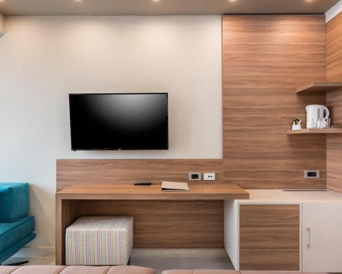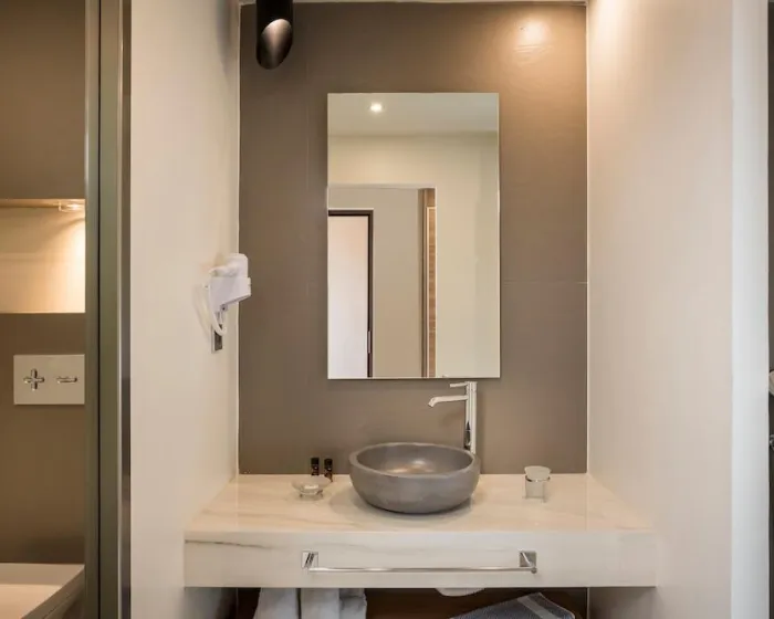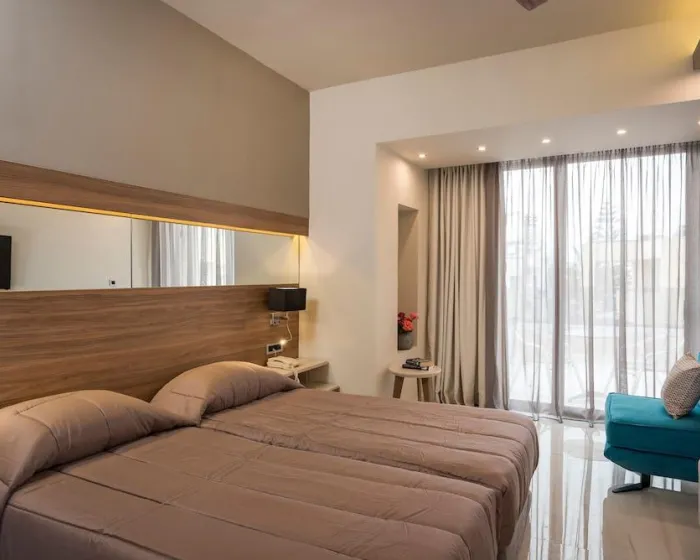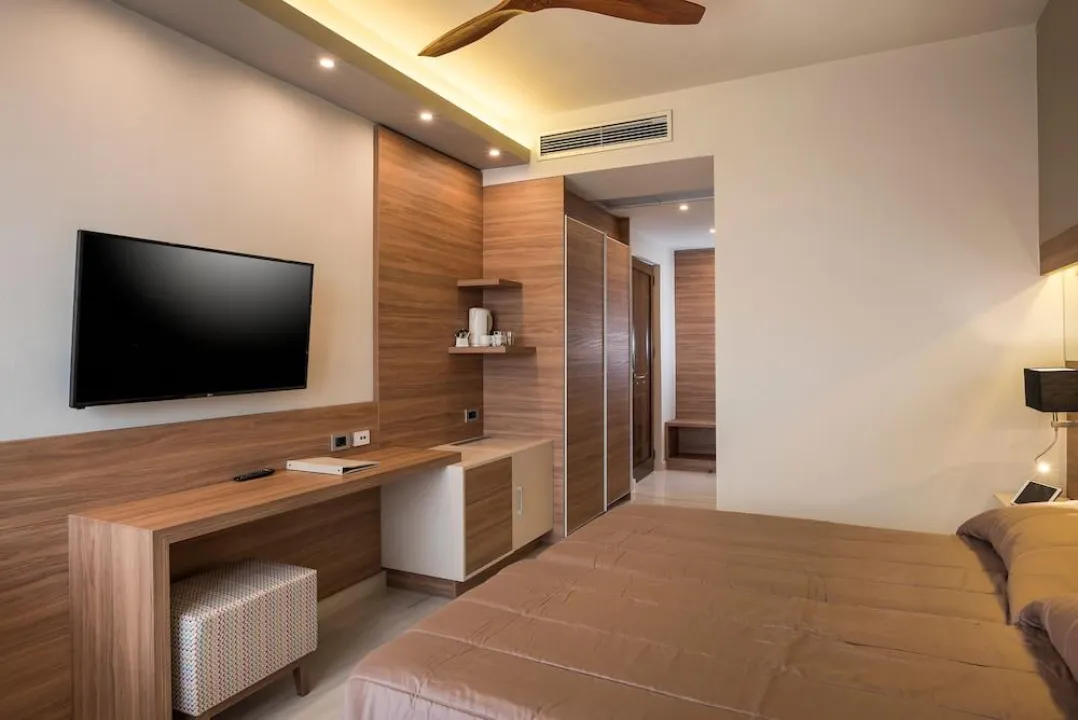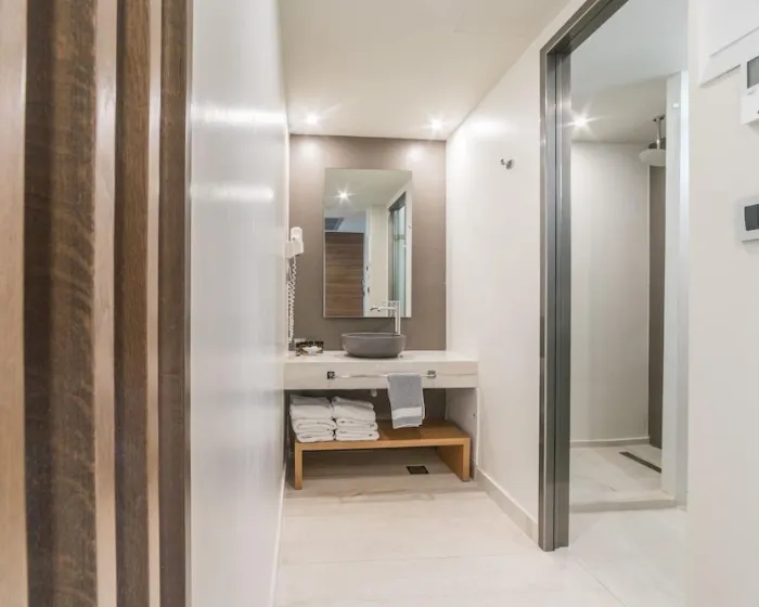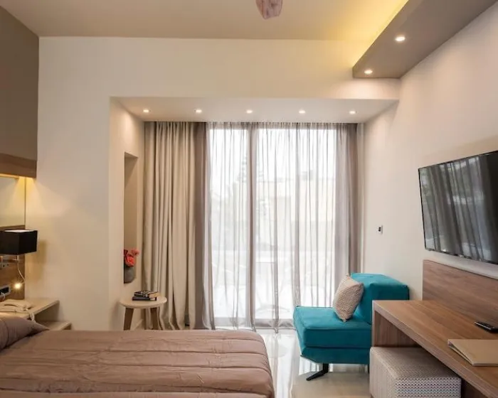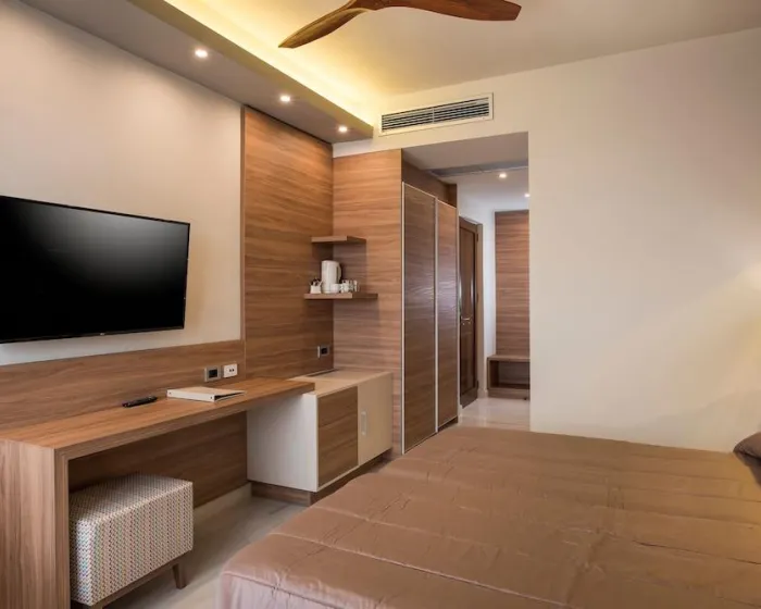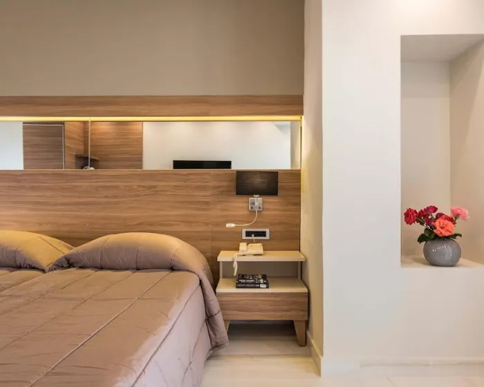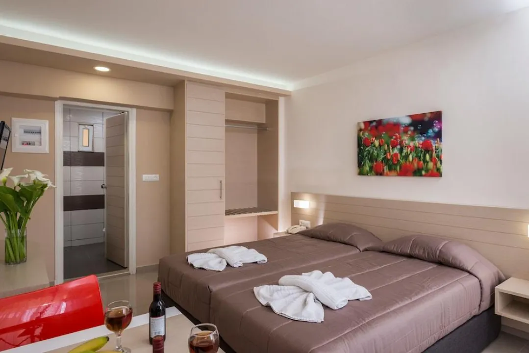 Rooms are equipped with air conditioning and central heating. Some rooms include a balcony. The rooms have a queen-size bed and a sofa bed. Extra beds can be requested. A safe and a desk are also available. Additional features include a refrigerator, a mini fridge and a tea/coffee station. A telephone, a TV, a radio and WiFi (no extra charge) provide all the essentials for a comfortable holiday. Bathrooms are equipped with a shower and a bathtub, as well as a hairdryer. Wheelchair-friendly rooms can be booked. The resort has family rooms and non-smoking rooms.
