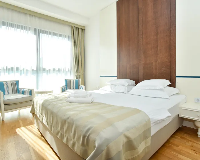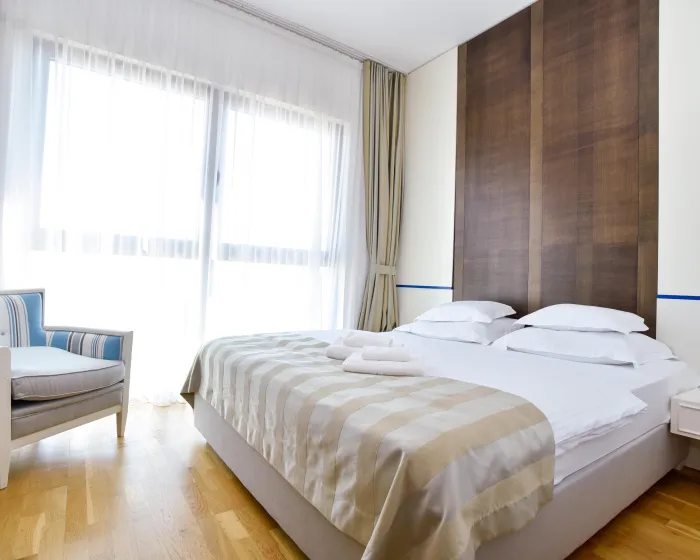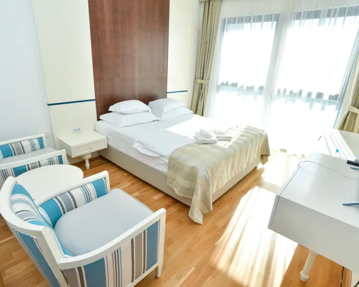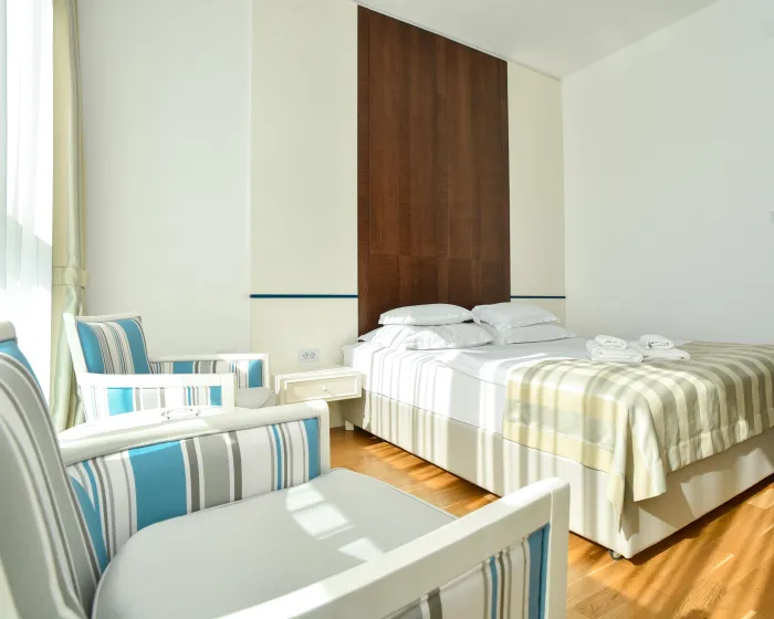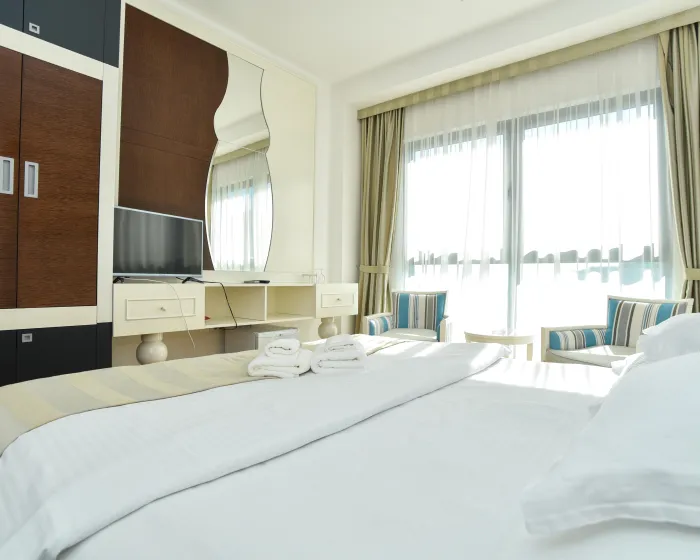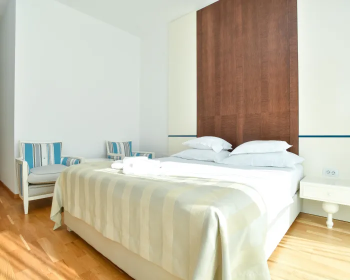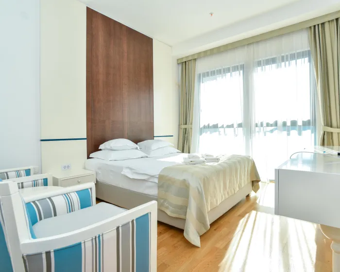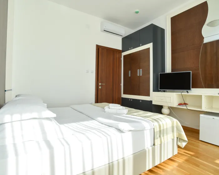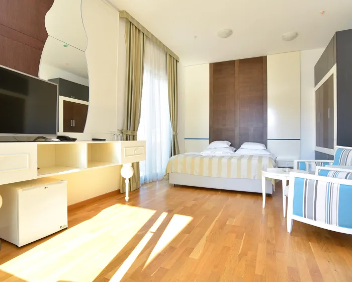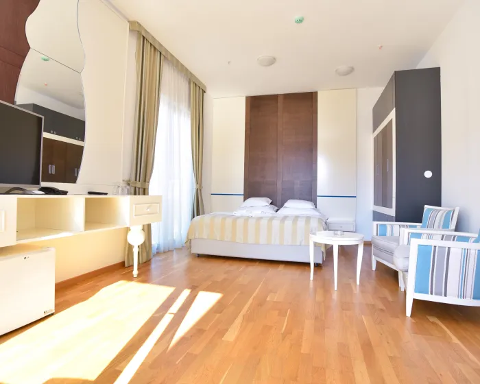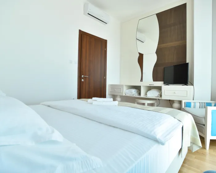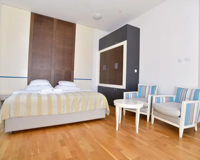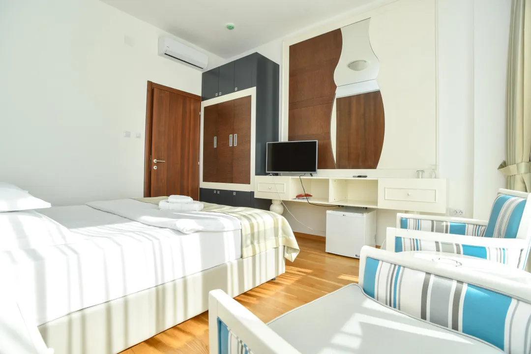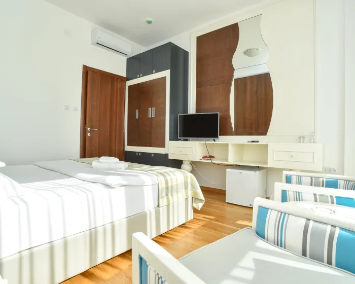 Većina jedinica ima pogled na more. U sobama se nalazi bračni krevet, krevet queen size ili sofa na razvlačenje. Dodatni kreveti mogu biti zatraženi. Sadržaji uključuju telefon i WiFi (bez dodatne naknade). Dostupne su porodične sobe za roditelje sa decom.