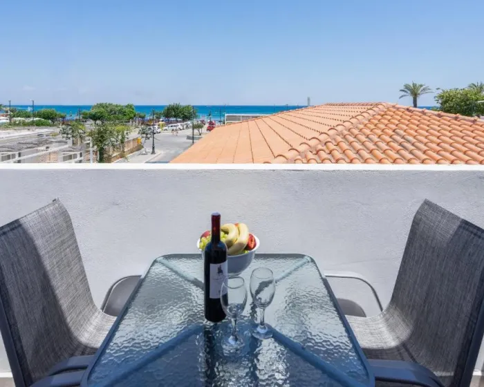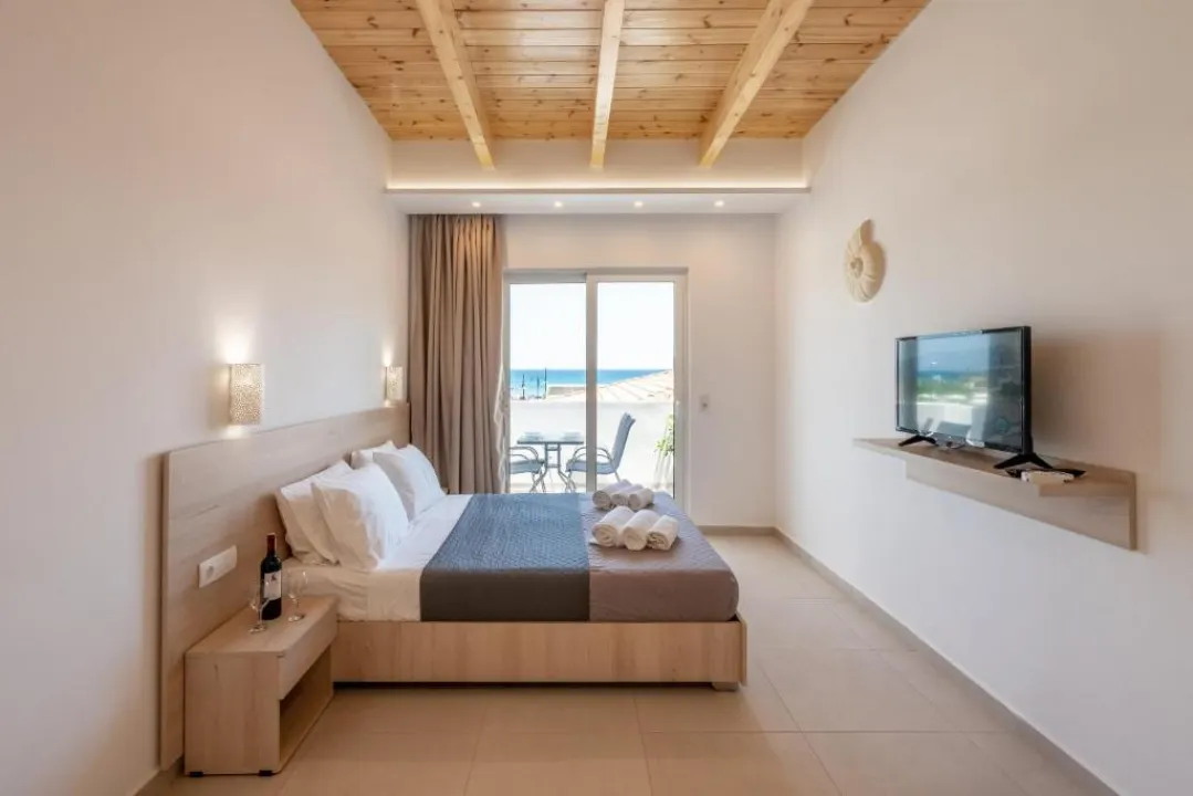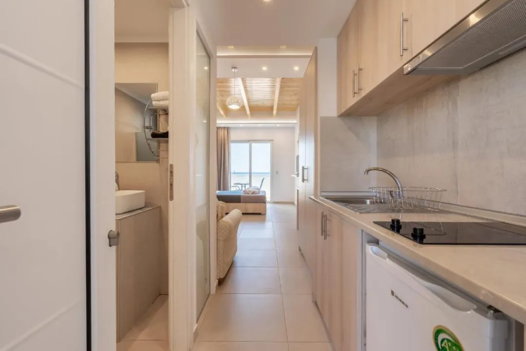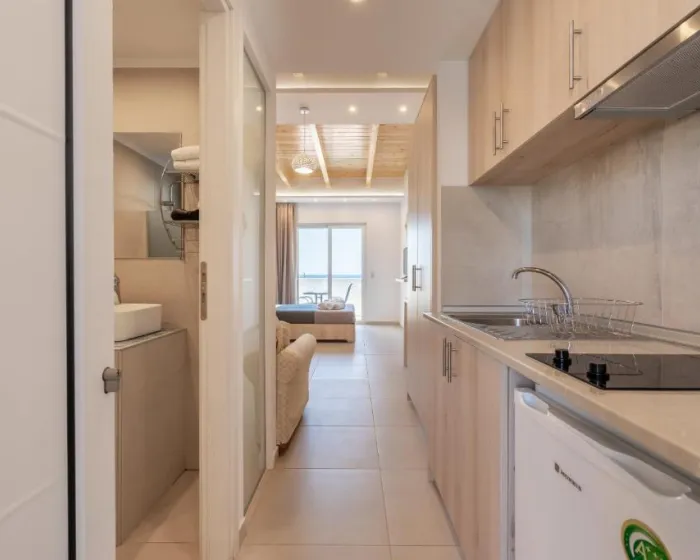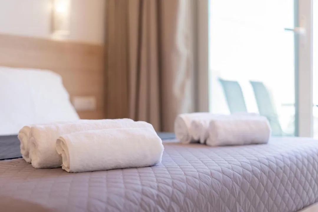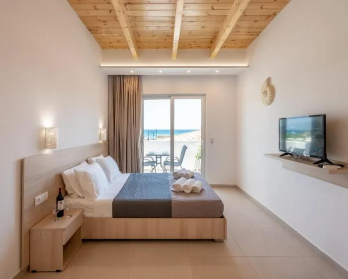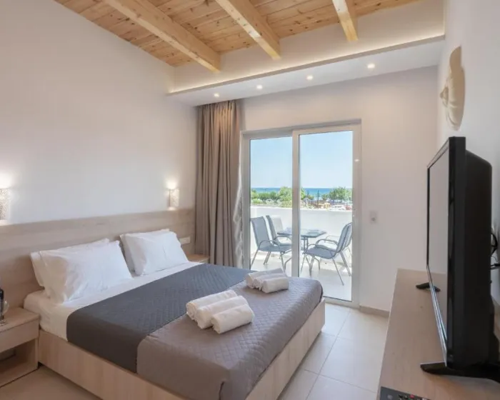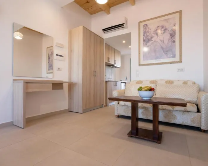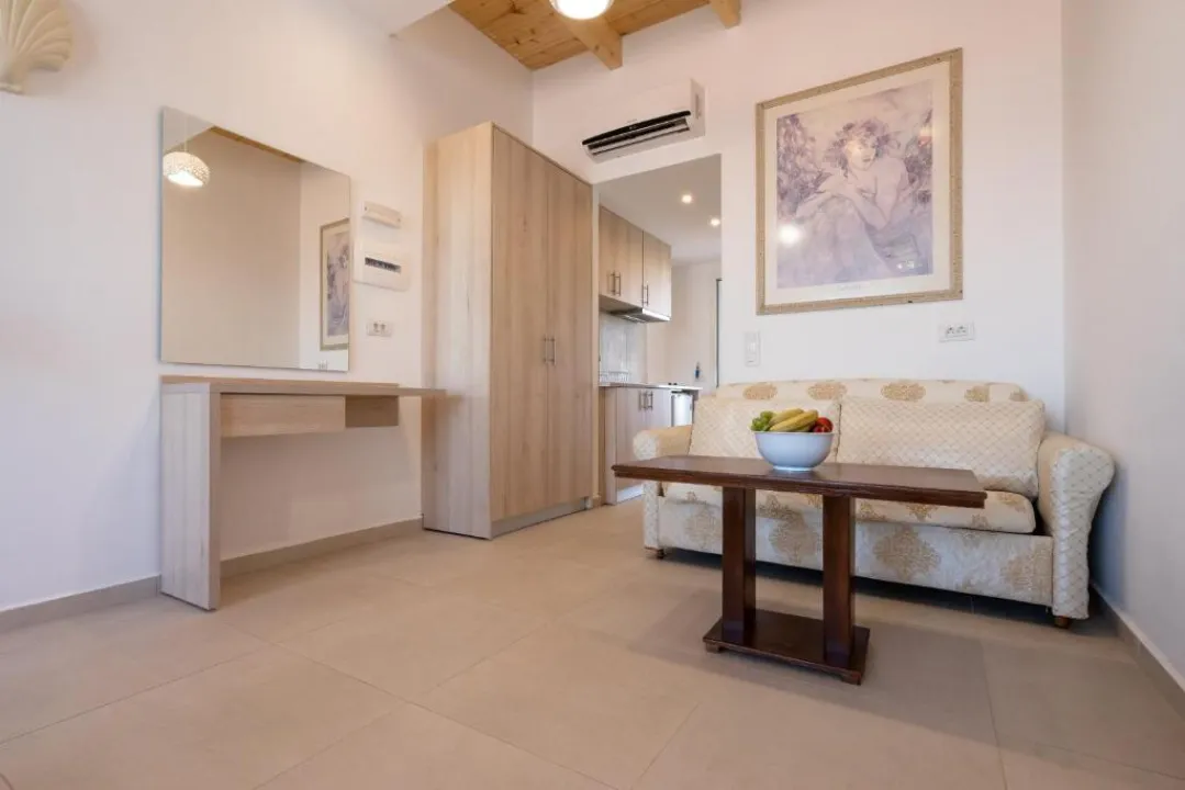 Klima uređaj i centralno grejanje obezbeđuju udobne temperature u sobama. Gosti mogu uživati u pogledu na more sa balkona ili terase. Sobe imaju bračni krevet i sofu na razvlačenje. Mogu se rezervisati odvojene spavaće sobe. Dečiji krevetići mogu biti zatraženi za mlađe goste. Dragocenosti se mogu sigurno čuvati u sefu. Kuhinja dolazi sa frižiderom, mini frižiderom i aparatima za kafu/čaj. Telefon, TV i WiFi (bez dodatne naknade) obezbeđuju sve neophodno za udoban odmor. Kupatila su opremljena tušem i fenom za kosu. Hotel ima sobe za nepušače.
