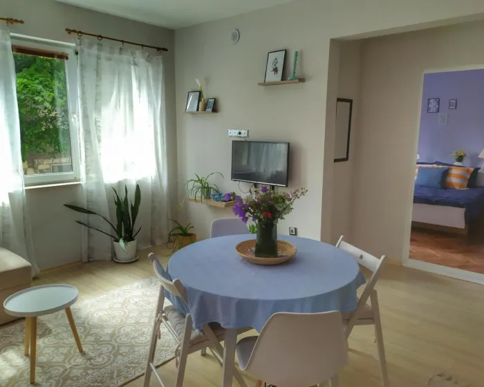 Klimatizovan stan se sastoji od 1 spavaće sobe, dnevnog boravka, potpuno opremljene kuhinje sa rernom i aparatom za kafu, i 1 kupatila sa tušem i fenom za kosu. Peškiri i posteljina su dostupni u apartmanu. Za dodatnu privatnost, smeštaj ima zaseban ulaz i zvučnu izolaciju.