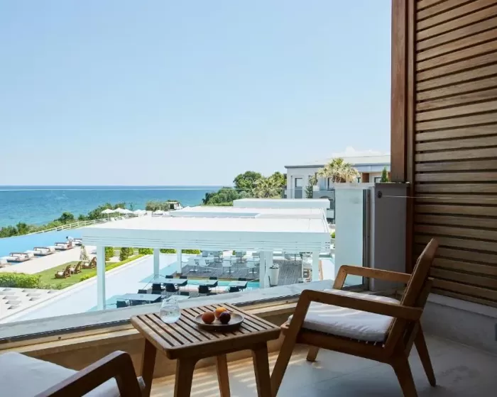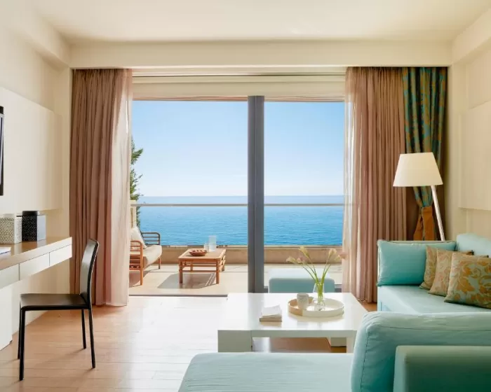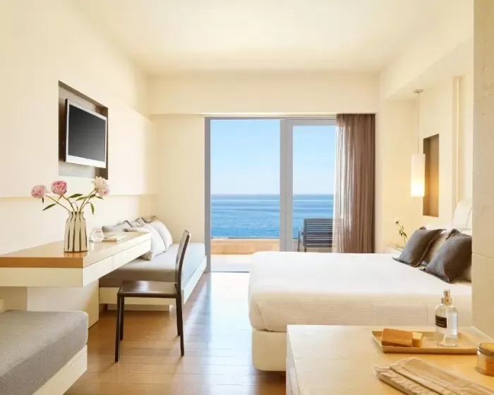 Ukupno 49 soba: Сlassic Rooms OV/SV (~28 m²), Doubles Superior OV/SV (~30-32 m²), Junior suites PP/SV (~35 m²), suites Executive PP/SV (~60 m²). U sobama: klima (hladjenje/grejanje), tuš sa hidromasažerom, pribor za kupatilo, fen, mini bar (uz doplatu na licu mesta), telefon, SAT TV, wifi internet, sef, balkon. Bračni krevet ili 2 odvojena kreveta (na zahtev samo u Сlassic Rooms). Pogled na Olimp ili more.