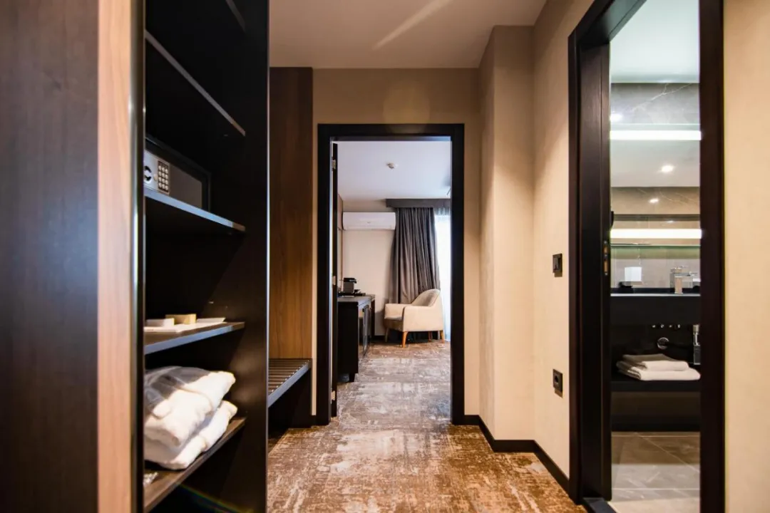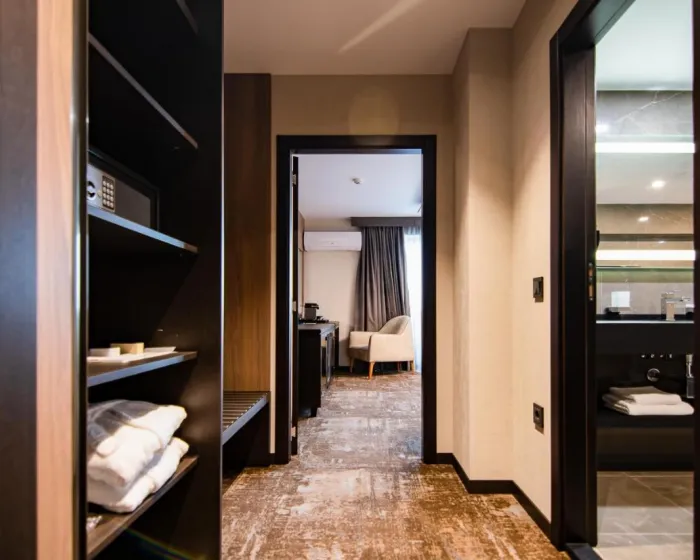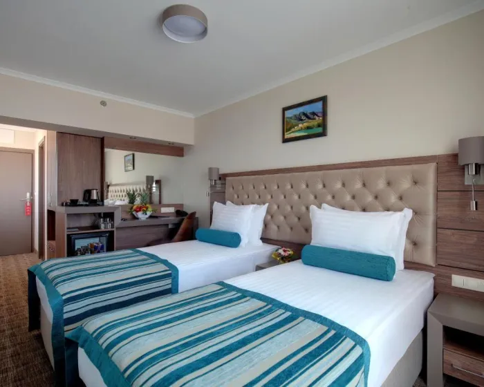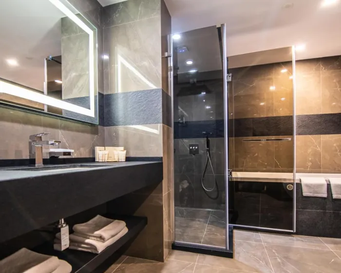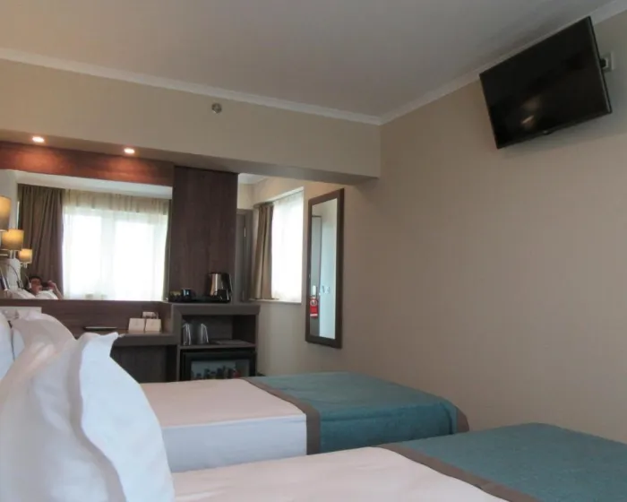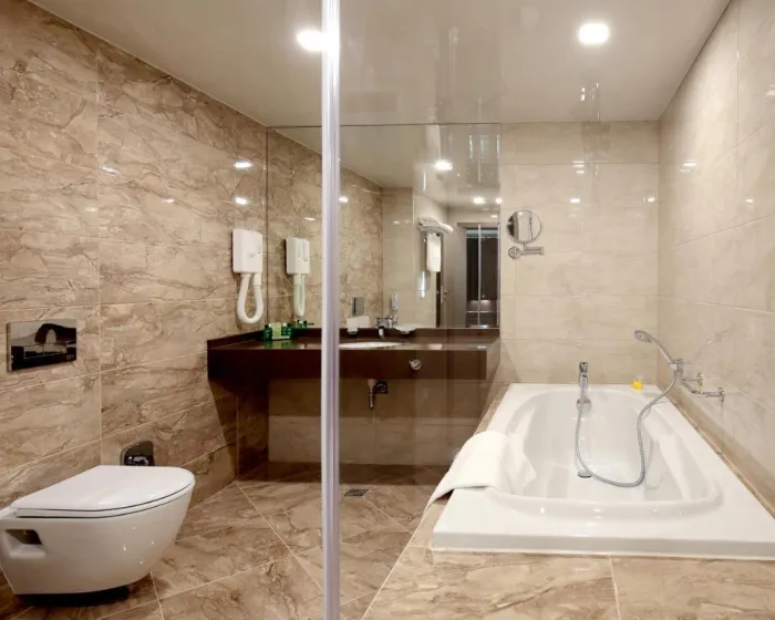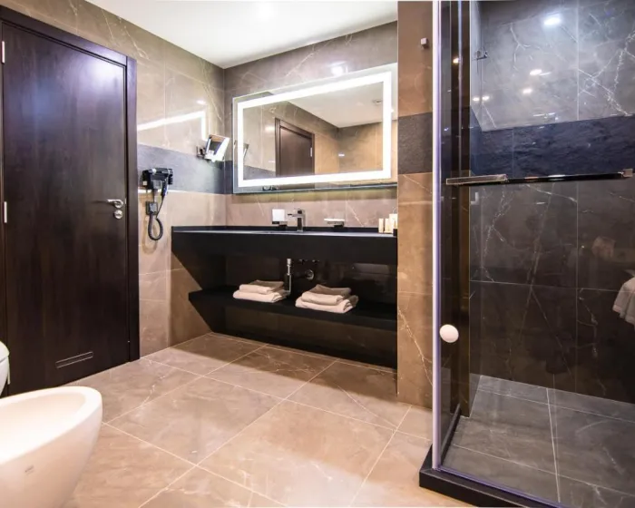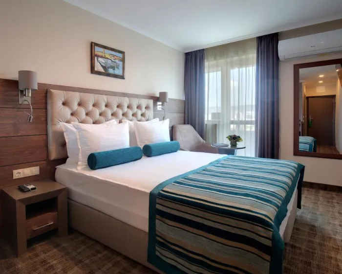 Air conditioning and central heating ensure that rooms maintain comfortable temperatures. Guests can enjoy the sea view from a balcony or terrace. Rooms have a double bed or a king-size bed. Children's beds and extra beds can be requested for younger guests. A safe, a minibar and a desk are also available. Guests will also find a refrigerator included among the standard features. An ironing set is provided for guests' convenience. A telephone, a television with satellite/cable channels, a radio and WiFi (no extra charge) are provided as well. A hairdryer and bathrobes are available in the bathrooms, which are equipped with a shower and a bathtub. For extra comfort in the bathrooms, guests are offered a selection of towels. Guests can also book wheelchair-friendly rooms with wheelchair-accessible bathrooms. The hotel has family rooms and non-smoking rooms.