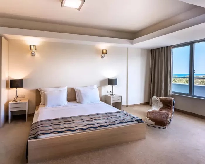 Superior soba bočni pogled more Oko 20 m², nedavno renovirana, idealna za porodice, koja se sastoji od jednog prostora, sa francuskim ili dva kreveta i jedna ili dve sofe. U glavnoj zgradi. Namenjena za 2-4 osobe.