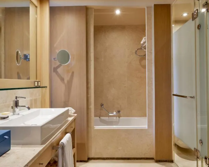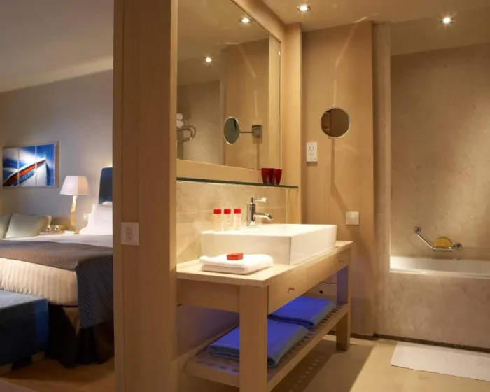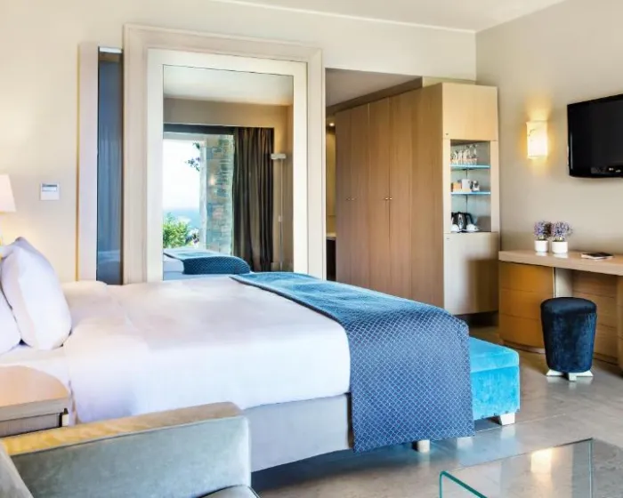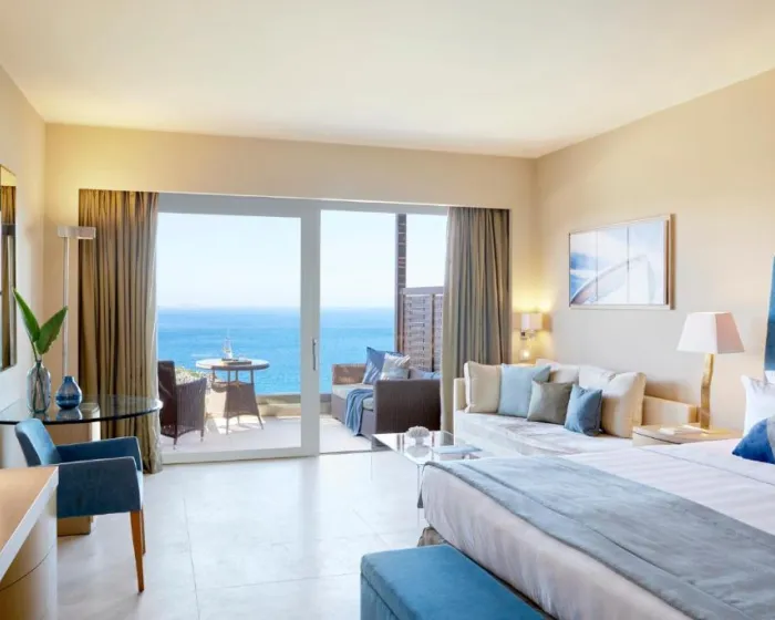 Sobe su klimatizovane i imaju centralno grejanje. Većina soba ima balkon ili terasu sa pogledom na more. Sobe su opremljene king-size krevetom i sofom na razvlačenje, dok su dečiji kreveti i dodatni ležajevi dostupni na zahtev. Gosti imaju na raspolaganju sef, minibar i radni sto. Standardne pogodnosti uključuju frižider, mikrotalasnu pećnicu, aparat za čaj/kafu i mašinu za pranje sudova. Pegla za pantalone je takođe dostupna za goste. Sobe su opremljene satelitskom/kablovskom televizijom, budilnikom i besplatnim WiFi internetom. Kupatila sadrže tuš i kadu, ogledalo za šminkanje, bade-mantile i set peškira. Resort nudi porodične i sobe za nepušače.