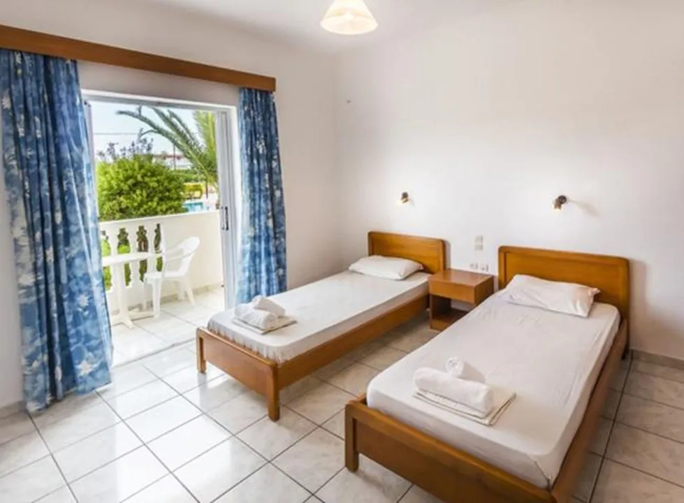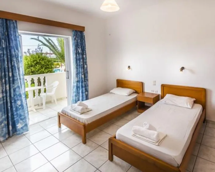Dodatne informacije: Govore se jezici: engleski i grčki. Kvintuple Standardni Apartman (Balkon ili Terasa): Sa jednim krevetom, kuhinjom, balkonom ili terasom i sefom (uz doplatu) kao i individualno podesivom klimom (uz doplatu). Četvorostruk Standardni Studio: Sa jednim krevetom, kuhinjom, balkonom ili terasom i sefom (uz doplatu) kao i individualno podesivom klimom (uz doplatu). Trostruki Standardni Studio (Pogled na vrt ili bazen): Sa jednim krevetom, kuhinjom, balkonom ili terasom i sefom (uz doplatu) kao i individualno podesivom klimom (uz doplatu). Dvokrevetni Standardni Studio (Pogled na vrt-bazen, Balkon ili Terasa): Sa jednim krevetom, kuhinjom, balkonom ili terasom i sefom (uz doplatu) kao i individualno podesivom klimom (uz doplatu).