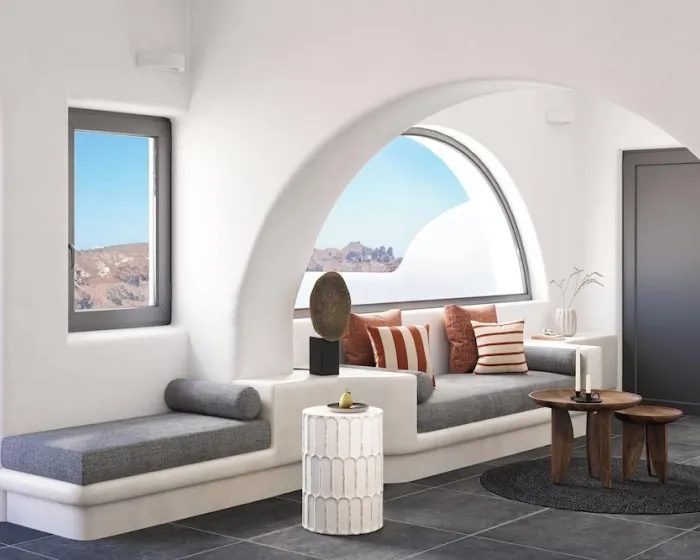 Svaka soba odiše sofisticiranošću i nudi udoban bračni krevet, klimatizaciju, moderno kupatilo sa tušem, kvalitetnu kozmetiku i fen za kosu. Na raspolaganju su i mini-bar, aparat za kafu, sef i besplatan bežični internet. Poseban doživljaj pruža terasa ili balkon sa panoramskim pogledom na Egejsko more i čuvene zalaske sunca, stvarajući savršenu atmosferu za romantične trenutke na jednom od najautentičnijih grčkih ostrva.