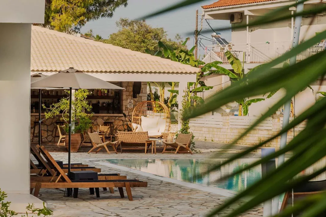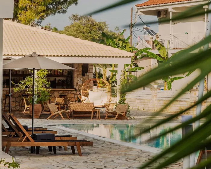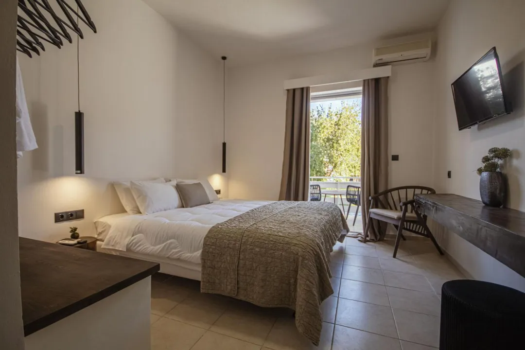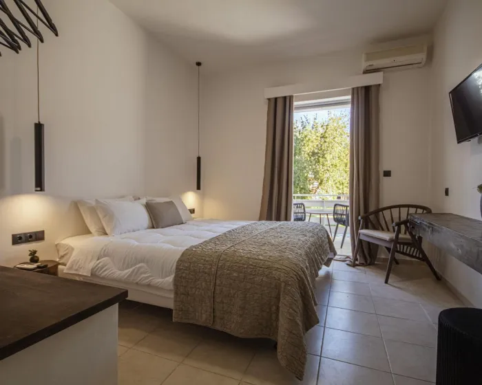 Laying amidst lush olive trees, the hotel is located next to the long, sandy beach of Kavos, in the southern part of Corfu Island.
