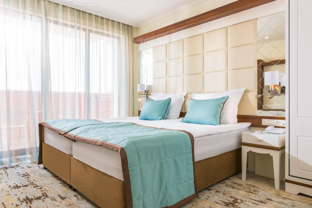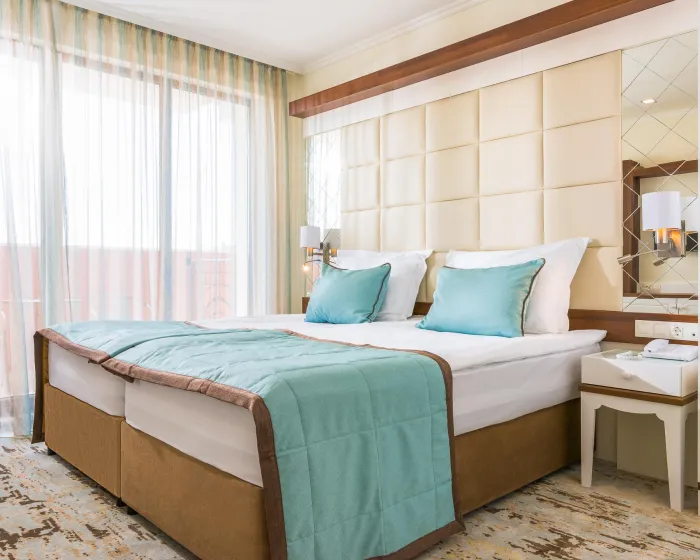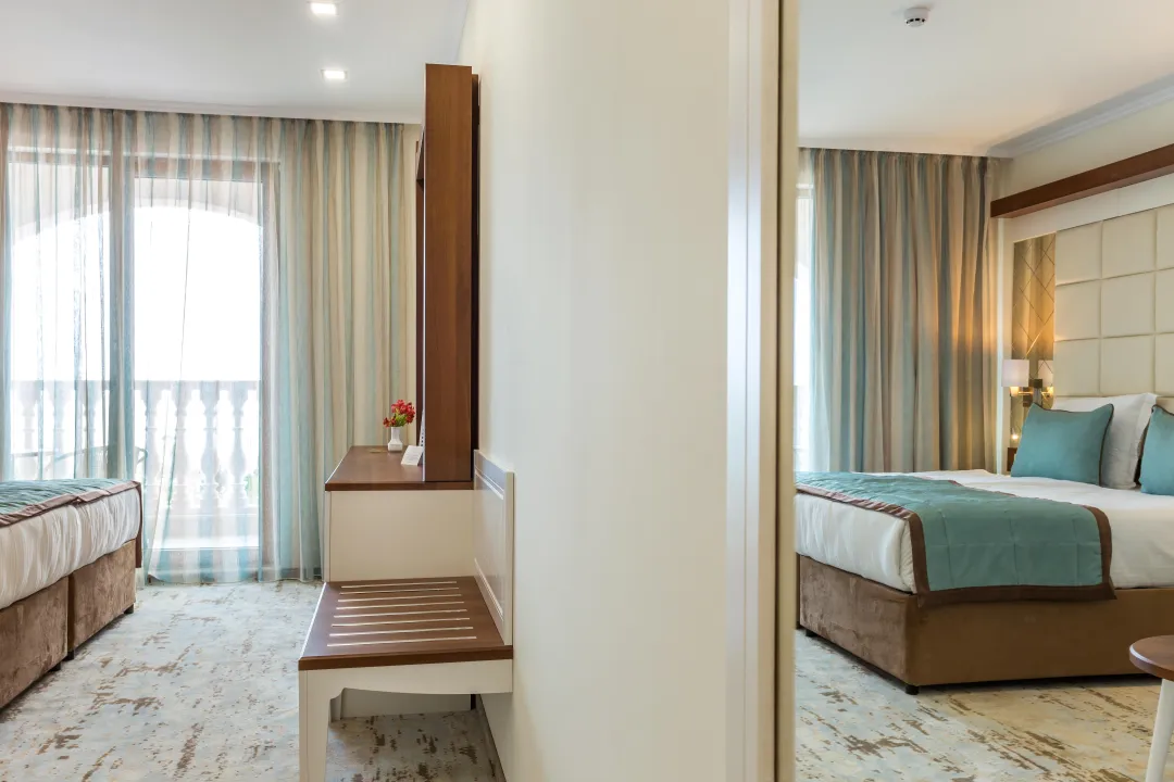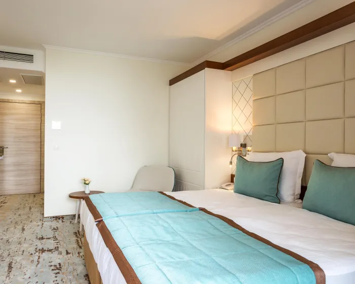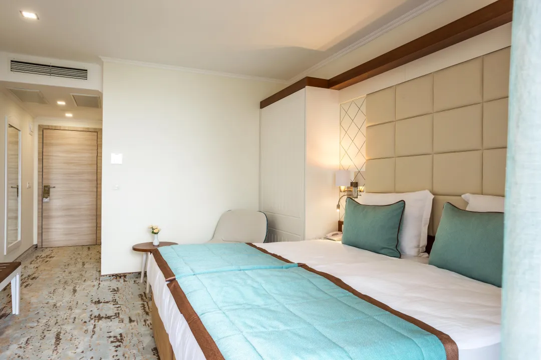 Sobe sadrže dnevni boravak i kupatilo, a klima uređaj osigurava idealnu temperaturu. Balkon sa delimičnim pogledom na more je uključen u većinu jedinica i podstiče goste da se zadrže neko vreme. Sve sobe su sa tepihom i uključuju bračni krevet i sofu na rasklapanje. Za mlade putnike, mogu se obezbediti dečiji krevetići. Takođe su dostupni sef i mini bar. Televizor sa satelitskim/kablovskim kanalima, radio i WiFi (bez dodatne naplate) pružaju sve neophodno za udoban odmor. Kupatila su opremljena tušem i kadom, kao i fenom za kosu. Sobe prilagođene za osobe u invalidskim kolicima sa pristupačnim kupatilima su takođe dostupne. Hotel ima 35 porodičnih soba i 215 soba za nepušače.