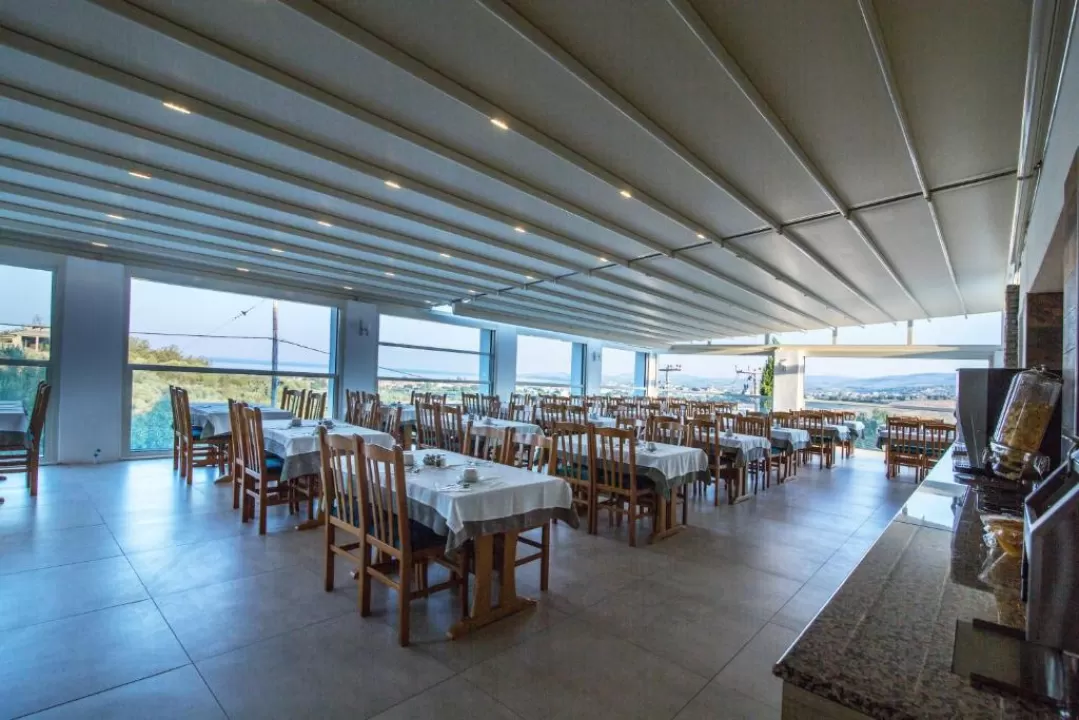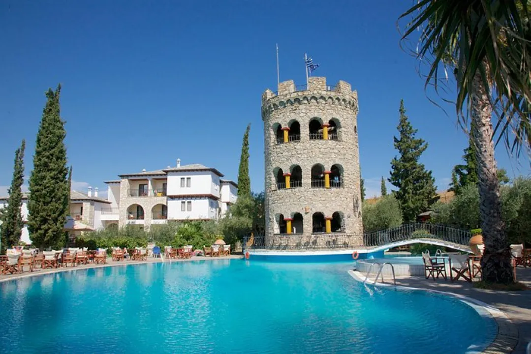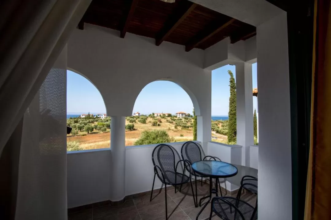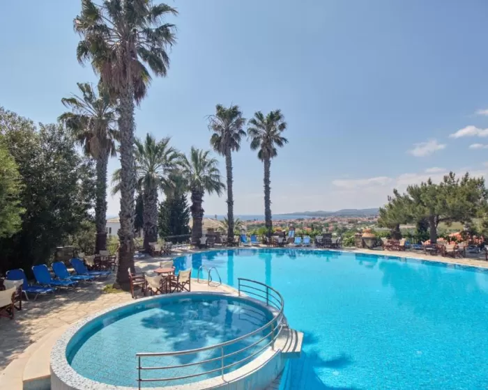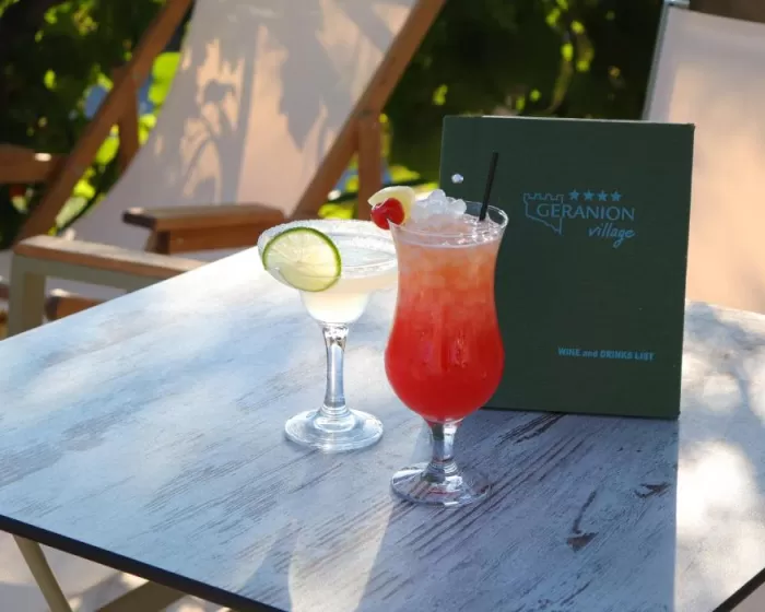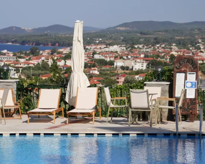 Geranion Village Hotel se nalazi u popularnom letovalištu Nikiti, na samom izlasku iz mesta, odmah nakon jedinog Lidla Sitonije. Od privatne hoteske plaže je udaljen oko 1500 metara, a od centra i crkve 2000 metara. U svom sastavu za smeštaj gostiju ovaj hotel ima 90 soba, koje mogu ugostiti maksimalno četiri osobe u porodičnim sobama. Geranion Village svojim gostima za animaciju nudi otvoreni bazen sa panoramskim pogledom na more i grad Nikiti, uredjenu baštu idečije igralište.