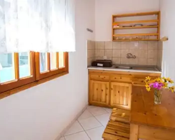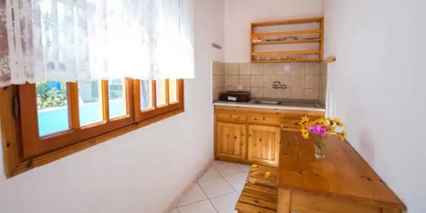 U studijima (25m²) se nalazi dva ili tri singl ležaja, kuhinja i kupatilo.Apartman (50m²) se sastoji iz prednjeg ulaznog trema (terase), hodnika, kuhinje, većeg kupatila, dve sobe sa po dva singl kreveta i izuzetno prostrane terase sa stepenicama kojima se silazi u dvorište. Obe sobe imaju zaseban izlaz na terasu. Klima uredjaj je u hodniku, iznad ulaznih vrata, a televizor je u jednoj od soba.