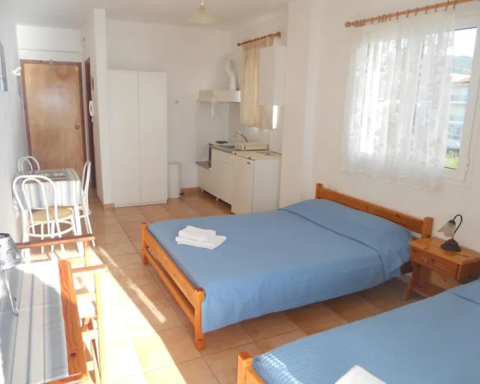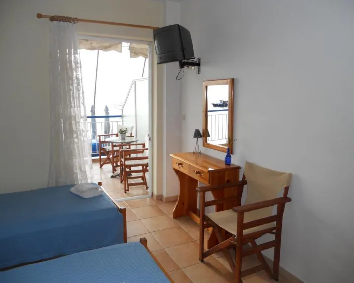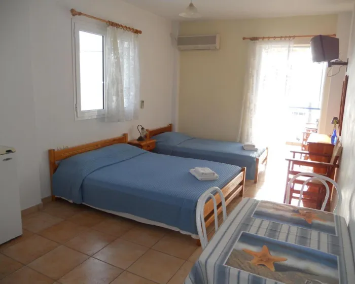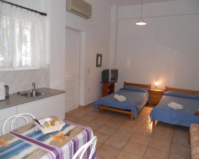 Sobe imaju kuhinju i kupatilo. Klima uređaj obezbeđuje prijatnu temperaturu. Pojedine sobe imaju balkon ili privatnu terasu sa pogledom na more. U sobama se nalaze bračni krevet ili sofa na razvlačenje. Na raspolaganju je čajna kuhinja sa frižiderom. Televizor sa satelitskim/kablovskim kanalima i WiFi obezbeđuju dodatnu udobnost. Kupatila su opremljena tušem, kozmetičkim preparatima i peškirima. Porodične sobe su dostupne za goste sa decom.