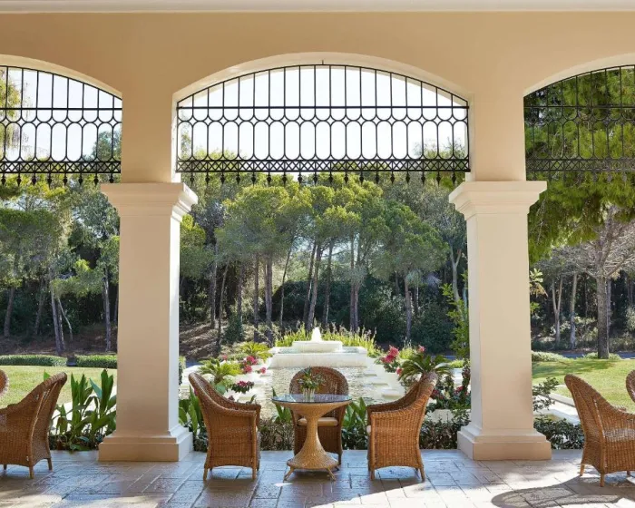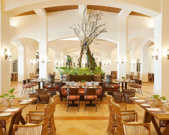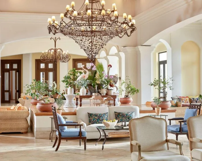 Hotelski kompleks kombinuje eleganciju i mediteranski šarm, sa modernim enterijerom i svetlim prostorijama.