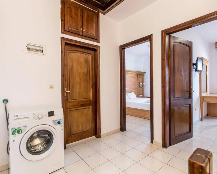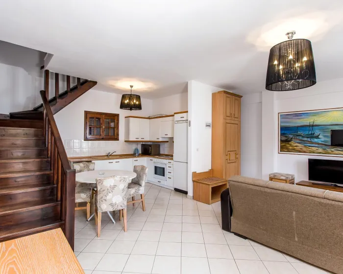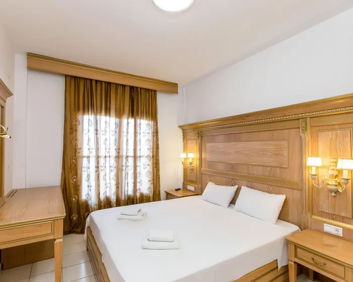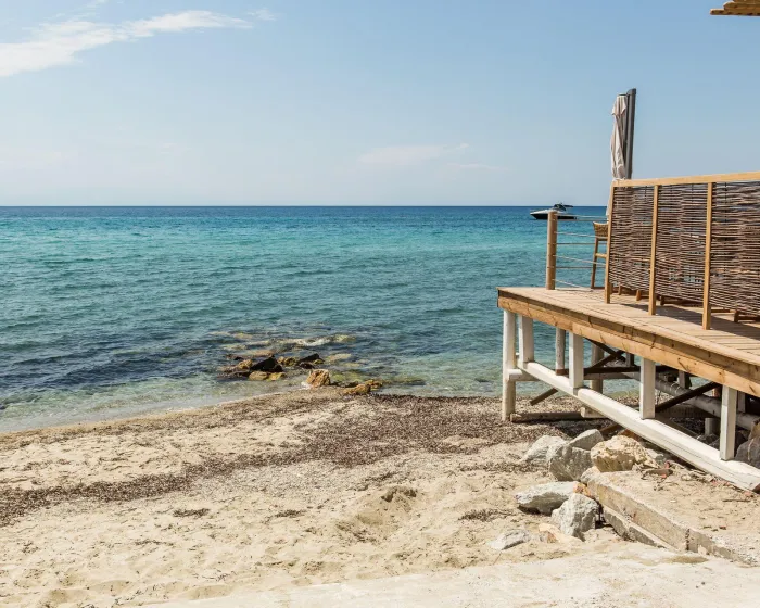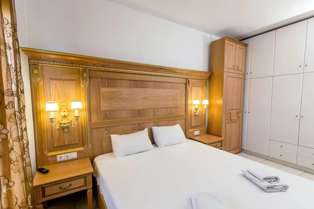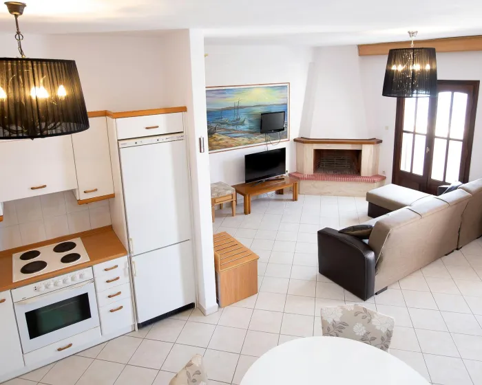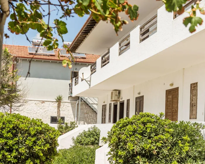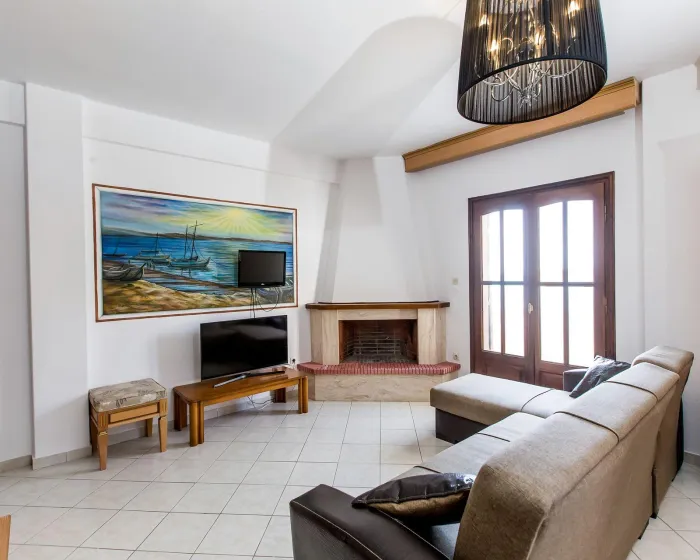 Ova rustična vila od 110 m² u stilu kuće na dva sprata, građena u tradicionalnoj arhitekturi, sa drvenim elementima. Na donjem spratu se nalazi dnevna soba sa potpuno opremljenom kuhinjom i pristupom verandi, kao i WC. Na drugom spratu se nalaze dve spavaće sobe, svaka sa svojim balkonom i kupatilom sa tuš kabinom. Vila je opremljena klima uređajem, TV-om, wi-fi. Maksimalni smeštaj je do 8 osoba. Grčka vila na plaži je savršen izbor za velike porodice sa decom ili grupe prijatelja. Gosti mogu koristiti sve sadržaje hotela i apartmana Greek Pride smeštenih na 300 m udaljenosti.