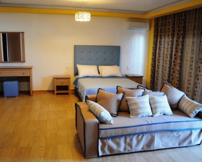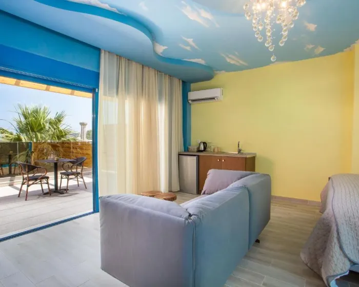 Klima uređaj osigurava da sobe održavaju ugodnu temperaturu. Gosti mogu uživati u pogledu na more sa balkona ili terase. Sobe imaju bračni krevet i sofu. Dodatni kreveti se mogu zatražiti. Sef i minibar su takođe dostupni. Frižider i čajna/kafena stanica su standardne funkcije. Set za peglanje je obezbeđen za praktičnost gostiju. Takođe su obezbeđeni telefon, TV i WiFi (bez dodatne naplate). Kupatila su opremljena tušem i kadom. Fen za kosu, ogledalo za šminkanje i bade mantili su dostupni za svakodnevnu upotrebu. Za dodatnu udobnost u kupatilima, gostima su ponuđeni kozmetički proizvodi. Hotel ima porodične sobe i sobe za nepušače.