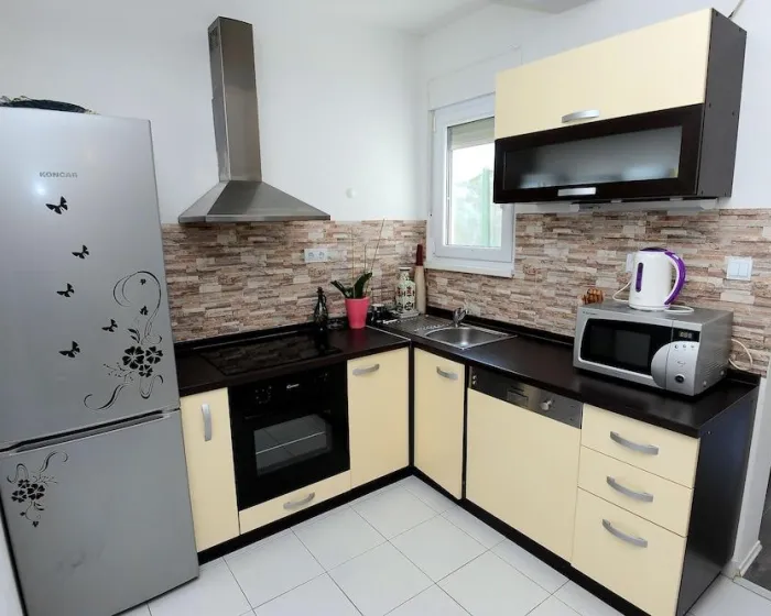 Udobno se smestite u ovoj kući za odmor, koja ima kuhinju sa šporetom i mikrotalasnom pećnicom.