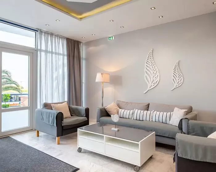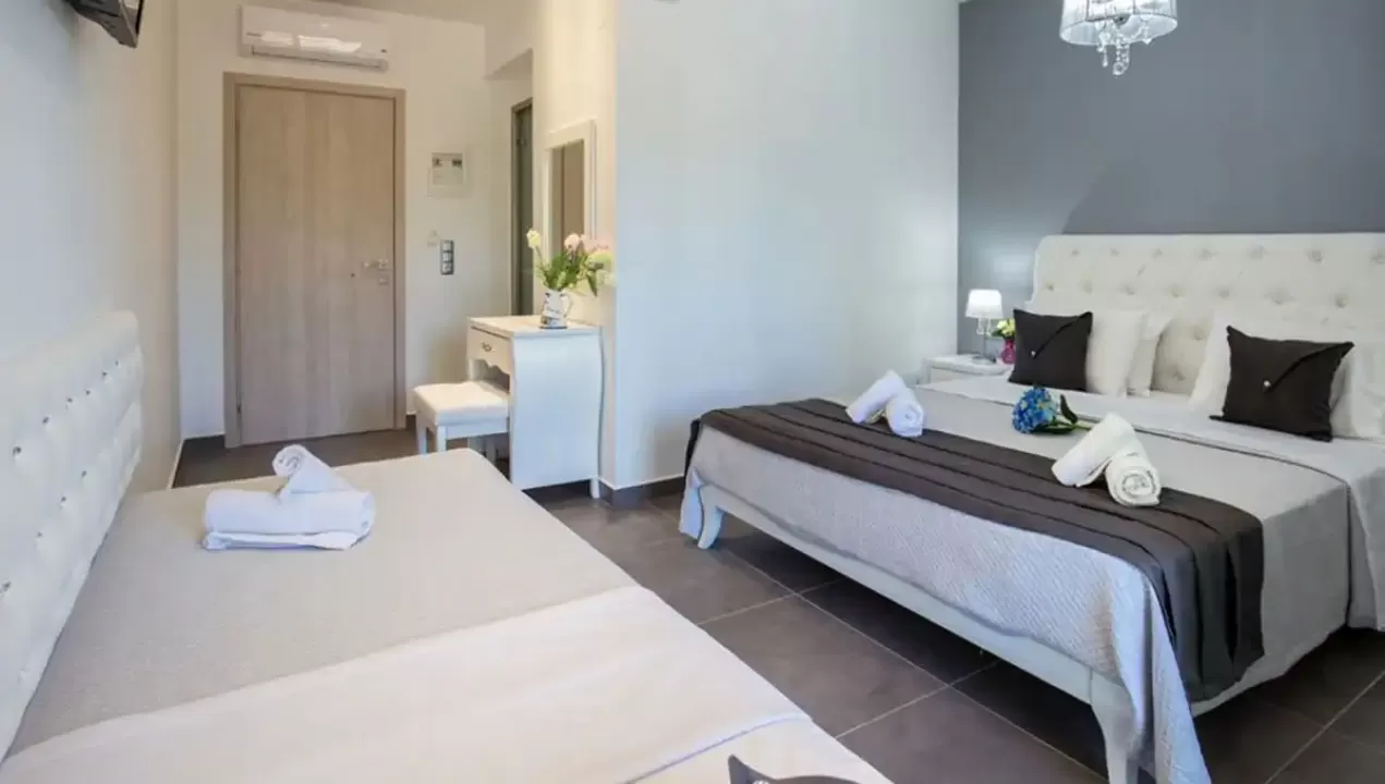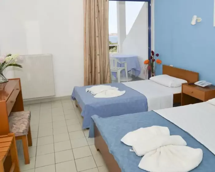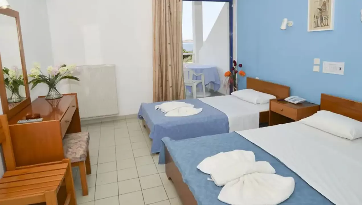 Nalazi se na samo 100 metara udaljenosti od popularne Psili Amos plaže, gde se nalazi broj beach barova i ribljih taverni. U neposrednoj blizini hotela se nalaze prodavnica i kiosk, kao i stanica autobusa. U svom sastavu za smeštaj gostiju hotel Astris Sun Astris posedje isključivo superior sobe koje mogu da prime maksimalno tri osobe.