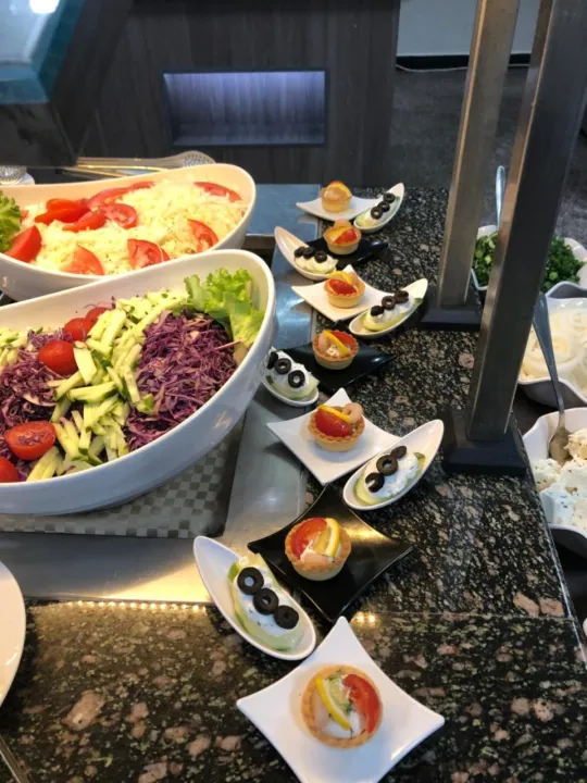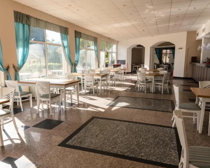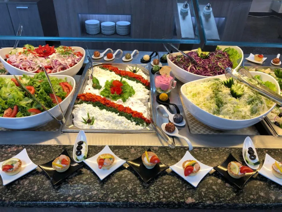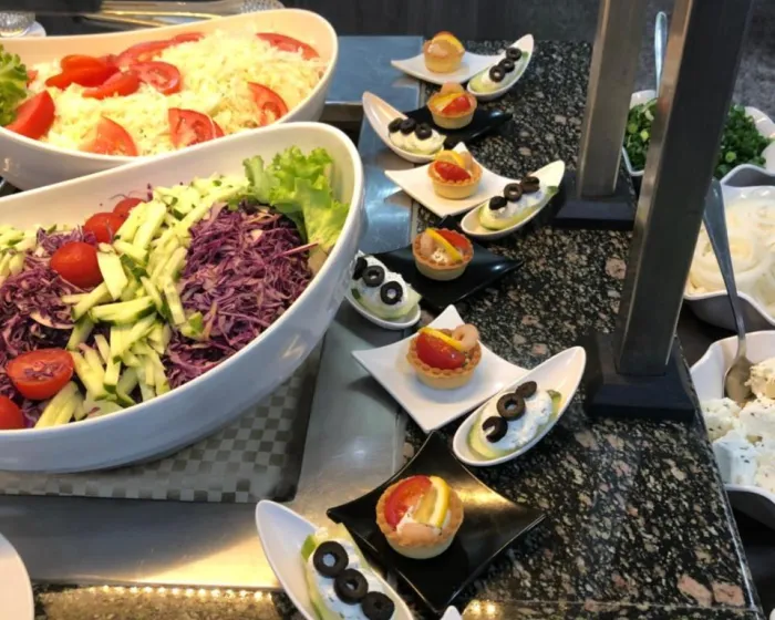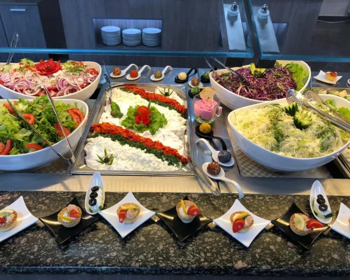 Ugostiteljski sadržaji uključuju restoran, kafić i bar. Opcije ishrane uključuju polupansion i sve uključeno. Među prednostima boravka na sve uključeno su izbor alkoholnih i bezalkoholnih pića, kao i posebne ponude poput snekova. Doručak, ručak i obiman večernji bife nude obilje ukusnih specijaliteta. Posebni obroci, uključujući vegetarijanske specijalitete, takođe su dostupni.
