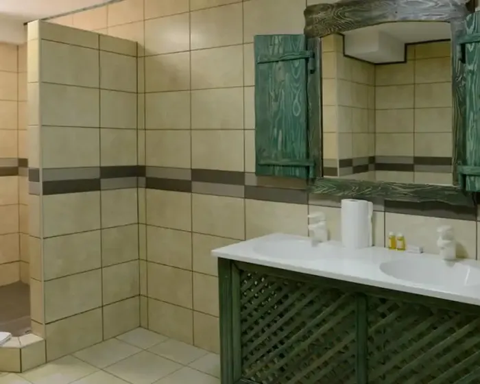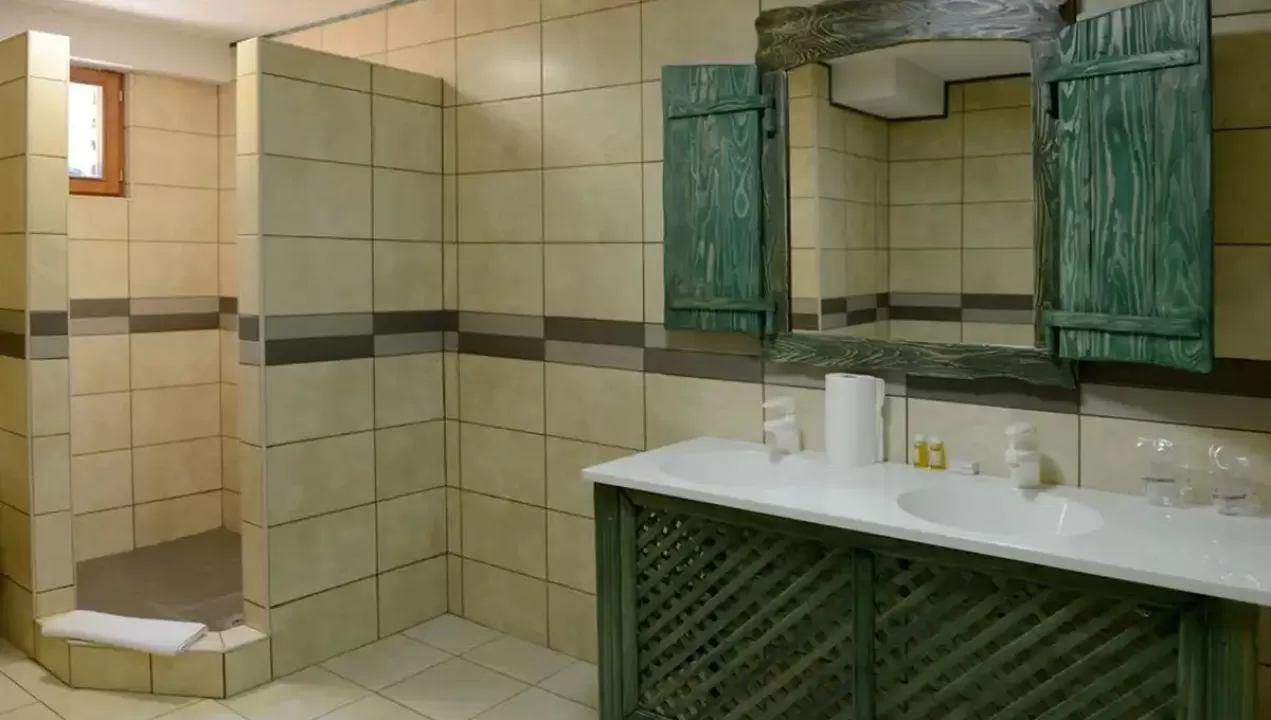kupatilo sa tušem, peškiri, fen, tv, telefon, wifi internet
