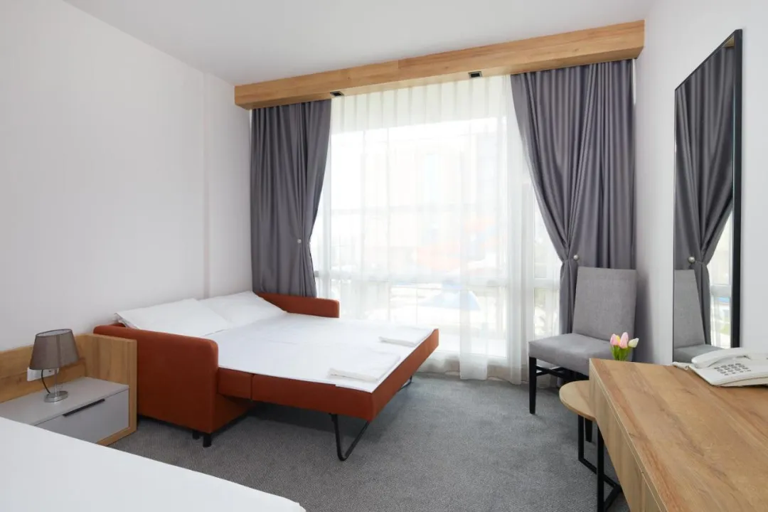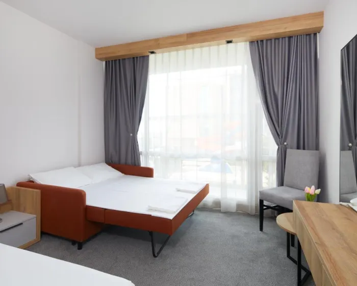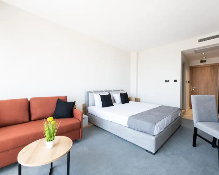 Klima uređaj i centralno grejanje osiguravaju udobne temperature u sobama. Gosti mogu uživati u pogledu na bazen sa balkona ili terase. Sve sobe su sa tepihom i uključuju bračni krevet i kauč na razvlačenje. Krevetac za decu i pomoćni krevet mogu se zatražiti za mlađe goste. Sef i minibar su takođe dostupni. Frižider, mini frižider i aparat za čaj/kafu su standardne karakteristike. Pegla je obezbeđena radi gostovog komfora. Direktni telefonski poziv, televizor sa satelitskim/kablovskim kanalima, radio i WiFi (bez dodatne naplate) su takođe obezbeđeni. Fen za kosu i telefon su obezbeđeni u kupatilima, koja uključuju tuš i kadu. Možete rezervisati sobe prilagođene za invalidska kolica. Hotel ima sobe za nepušače.