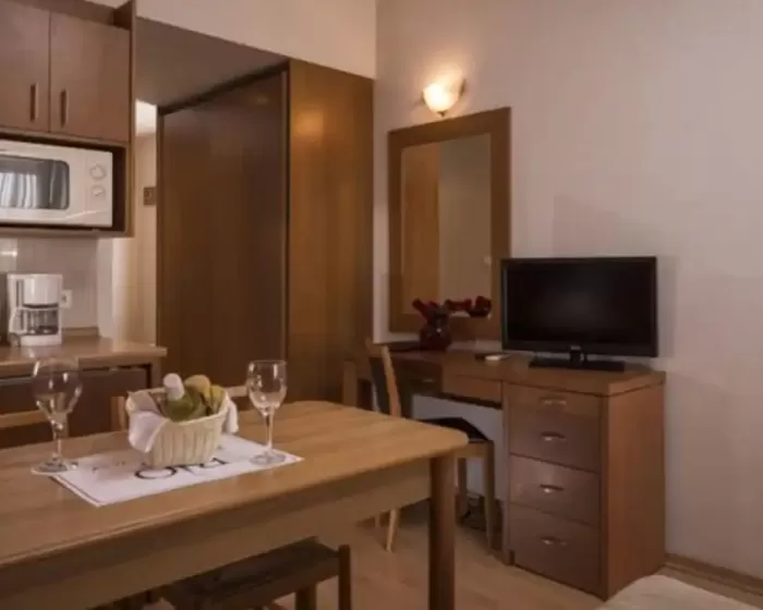 Hotel poseduje prostrana studija i apartmane. Apartmani su za maksimalno 4 osobe i sastoje se od spavaće i dnevne sobe. Studija su jednosobna i maksimalno primaju do 3 osobe. Svi su opremljeni mini kuhinjom sa osnovnim posudjem za kratku pripremu laganih obroka, klima (besplatno), wifi (besplatno), sef (uz doplatu), frižiderom, aparatom za kafu, mikrotalasnom.