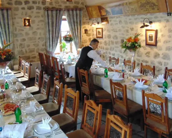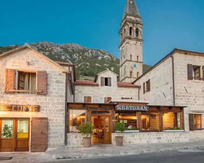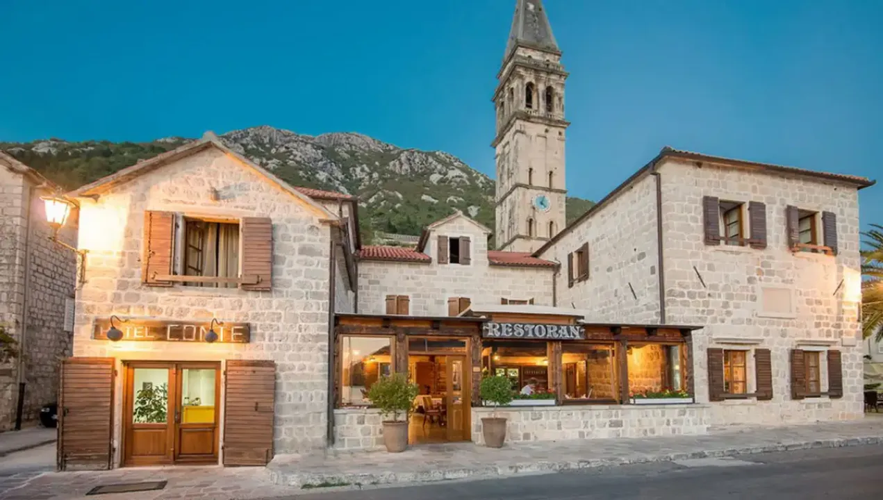 Hotel Conte Perast se nalazi na oko 400 metara udaljenosti od peščane i kamenom popločane plaže, na glavnom gradskom trgu, u zgradi nekadašnjeg Doma kulture, u Blizini crkve Sv. Nikole. postoji mogućnost parkiranja u blizini hotela. Restoran Conte, koji je prepoznatljiv po autentičnom ambijentu i velikom izboru specijaliteta tradicionalne mediteranske kuhinje, nudi usluge organizovanja proslava raznih oblika, svadbenih svečanosti, poslovnih ručkova, seminara i različitih vrsta okupljanja.Ishrana: doručak - švedski sto.