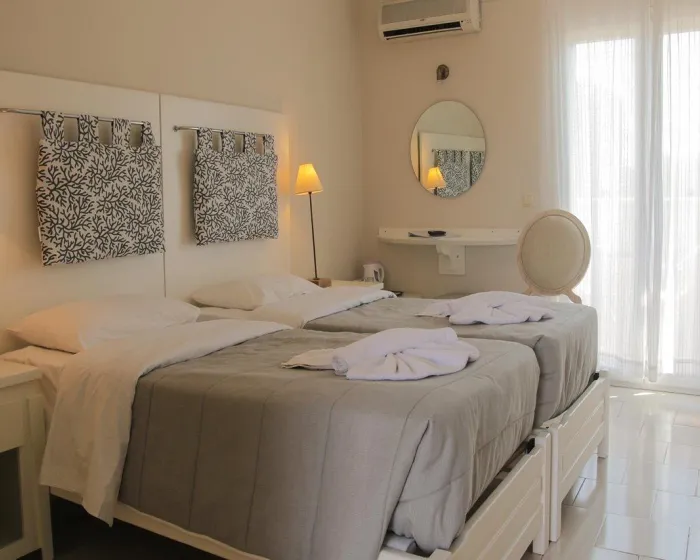 Sobe su opremljene klima uređajem i individualno podesivim grejanjem. Gosti mogu uživati u pogledu na more sa balkona ili terase. Sobe imaju bračni krevet i sofu. Dostupne su odvojene spavaće sobe. Krevetići za decu mogu biti zatraženi za mlađe goste. Takođe su dostupni sef i minibar. Dodatne mogućnosti uključuju frižider, mini frižider i aparata za čaj/kafu. Direktno biranje telefonom, TV i WiFi obezbeđuju optimalnu udobnost. Fen za kosu i telefon su dostupni u kupatilima, koja su opremljena tušem i kadom. Dostupne su i sobe prilagođene za osobe sa invaliditetom. Hotel ima porodične sobe i sobe za nepušače.