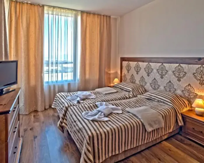 Jednosobni apartman za smeštaj 2-4 osobe (2+2): 56-66 m2, spavaća soba sa francuskim ležajem ili dva odvojena ležaja, dnevni boravak sa sofom na rasklapanje, kompletno opremljena kuhinja,  kupatilo sa fenom za kosu, sa balkonom ili bez balkona.