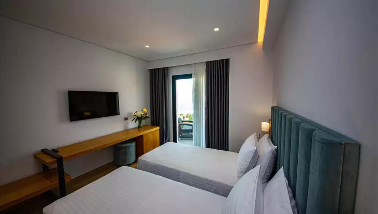 kupatilo, fen, telefon, TV, mini frižider, klima uredjaj, wi fi internet i balkon sa garniturom za sedenje