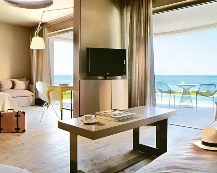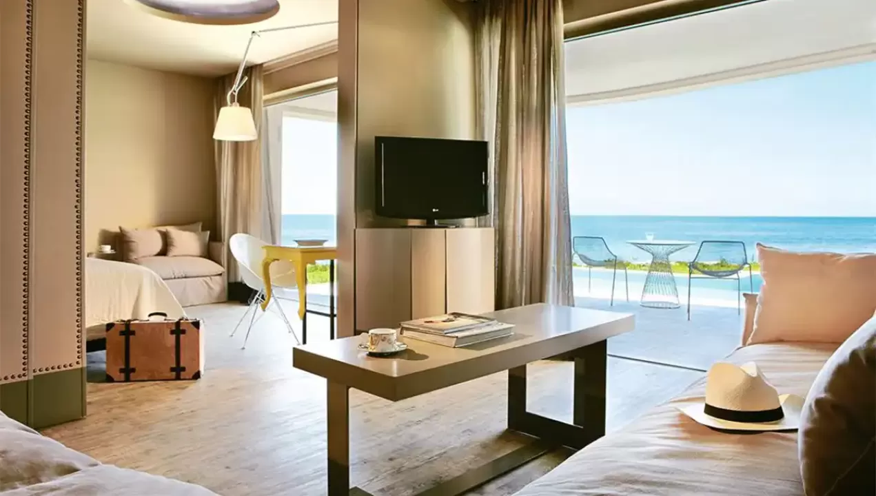 Suite Executive Astir Private Pool Centralna zgrada, pogled na more, dnevni boravak, kupatilo, spavaća soba sa francuskim ležajem i bade mantili i papuče, mini bar.