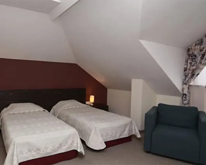 Suite sa dve spavaće sobe Lux 50 m², francuski ležaj, dva odvojena standardna ležaja I dva pomoćna ležaja, grejanje, balkon, TV SAT, telefon, pristup internetu, mini bar, fen, kupatilo, kamin, odvojene prostorije.