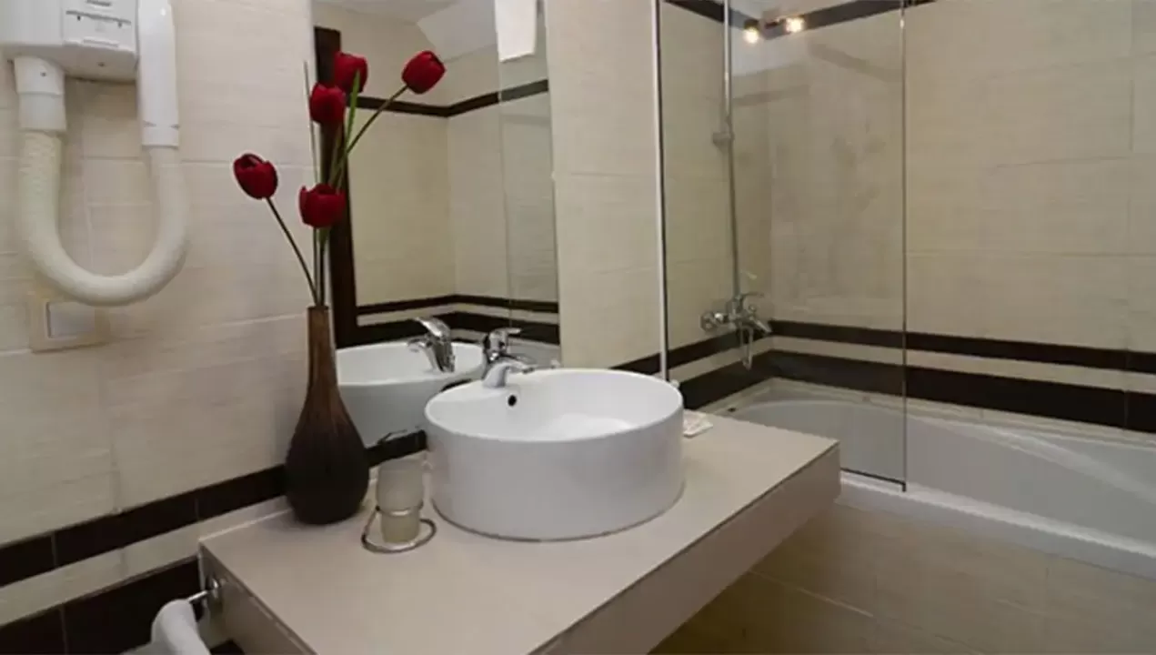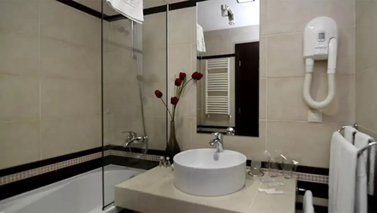 dva odvojena kreveta, fotelju na razvlačenje, SAT-TV, telefon, mini-bar, radio, kupatilo sa kadom i fenom.