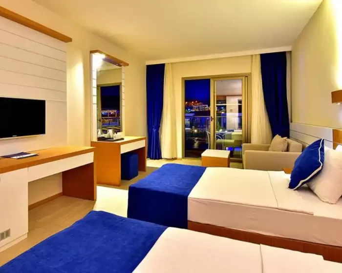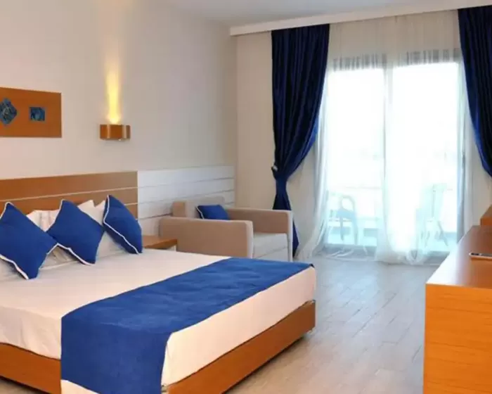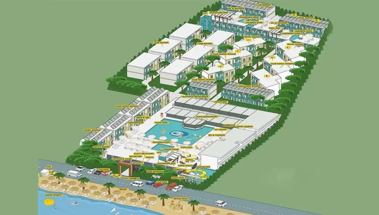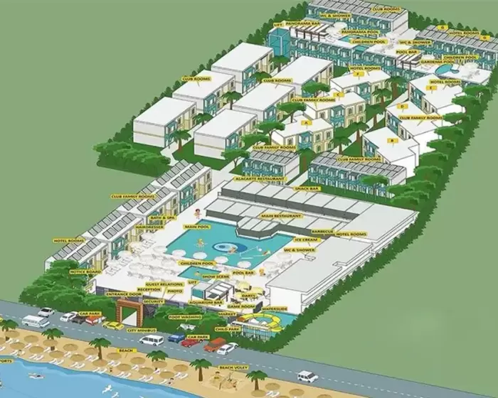 Hotelski kompleks se sastoji od jedne trospratne zgrade i 20 dvospratnih i trospratnih blokova. Raspolaže sa 83 Hotel sobe (30 m², za maksimalno 3 osobe), 138 Klub soba (27 m², za maksimalno 3 osobe) i 60 dvosobnih klub porodičnih soba (38 m², za maksimalno 4 osobe). Sve sobe imaju balkon ili terasu, klima uređaj (klub sobe - individualni, hotelske sobe - centralni), telefon, TV, sef, mini-bar (prazan), fen za sušenje kose. Hotel sobe su sve renovirane i moderno opremljene.
